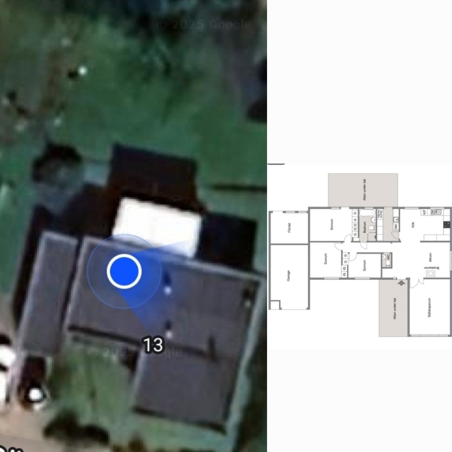 Störst yta att bygga ut åt på är norr, vilket blir till höger på bilden. Åt samma håll som kök och altan (som förövrigt också kommer behöva byggas om).