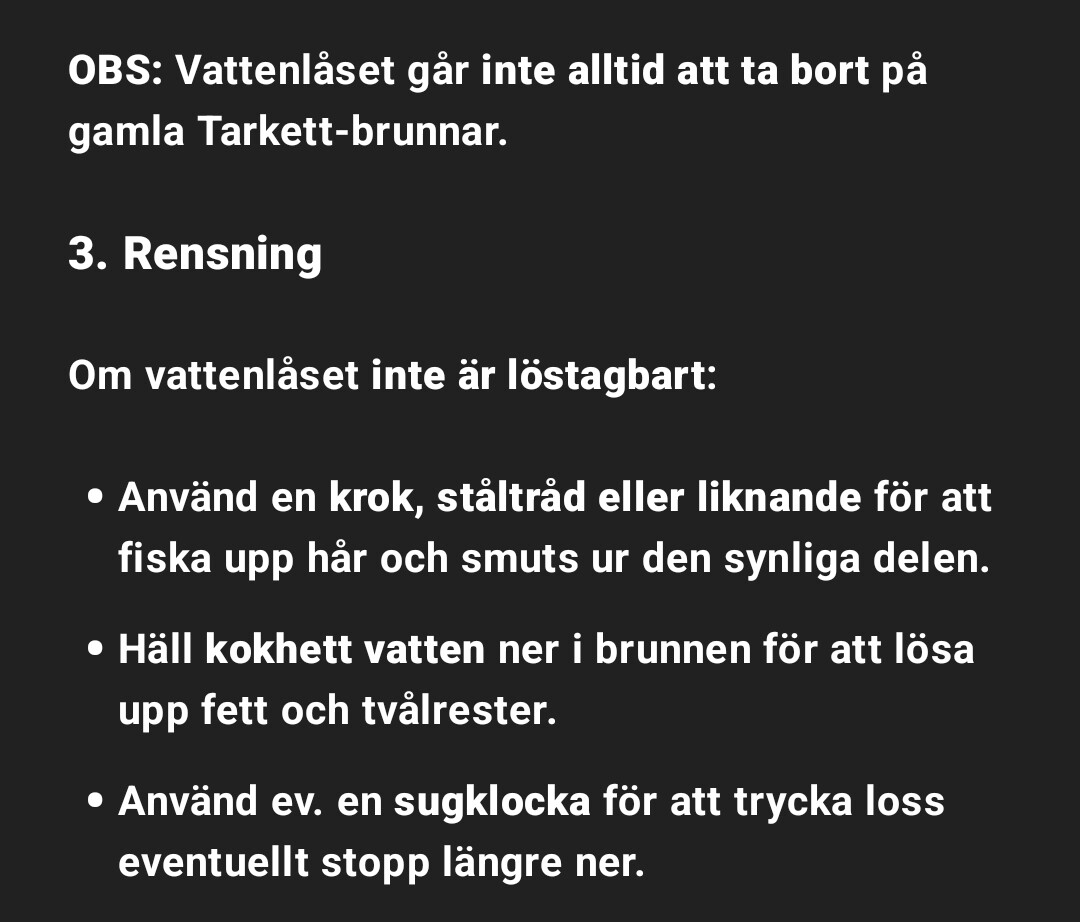 Är ganska säker på att det är en brunn från Tarkett enligt följande och då får man fiska upp hår etc. och sen spola med varmt vatten för att göra rent.