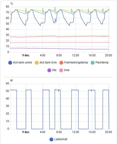 Kan vara att tankens botten är varmare är pannans botten och det värmer på i pannans botten, blir då en liten självcirk genom laddomaten. När värmen stiger uppåt i pannan. I laddomatens underdel finns en ventil som är öppen när pumpen står still, den är för att självcirk ska bil genom pannan och kyla pannan, om pumpen stannar av någon orsak. Förhindra att pannan går i kok direkt, innan alla spjäll stängs.