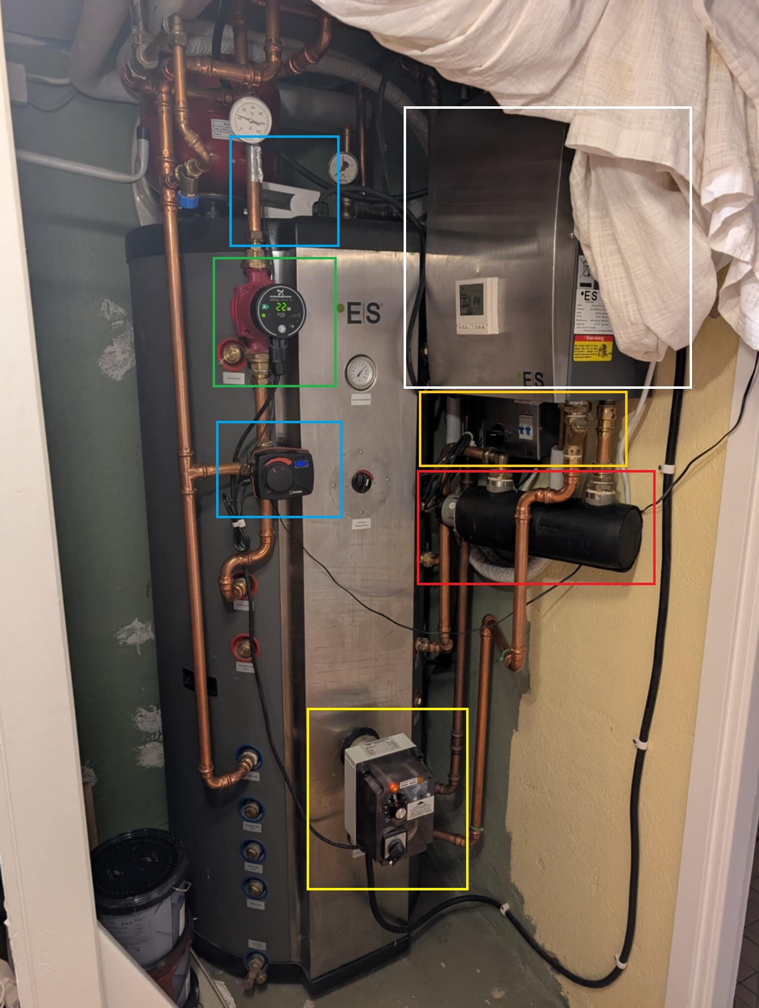 I BLÅ rutor är det såvitt jag förstår det ett ESBE "vridande styrdon" som öppnar eller stänger ventil beronde på temperatur, som ställs in via trådlöst ställdon.