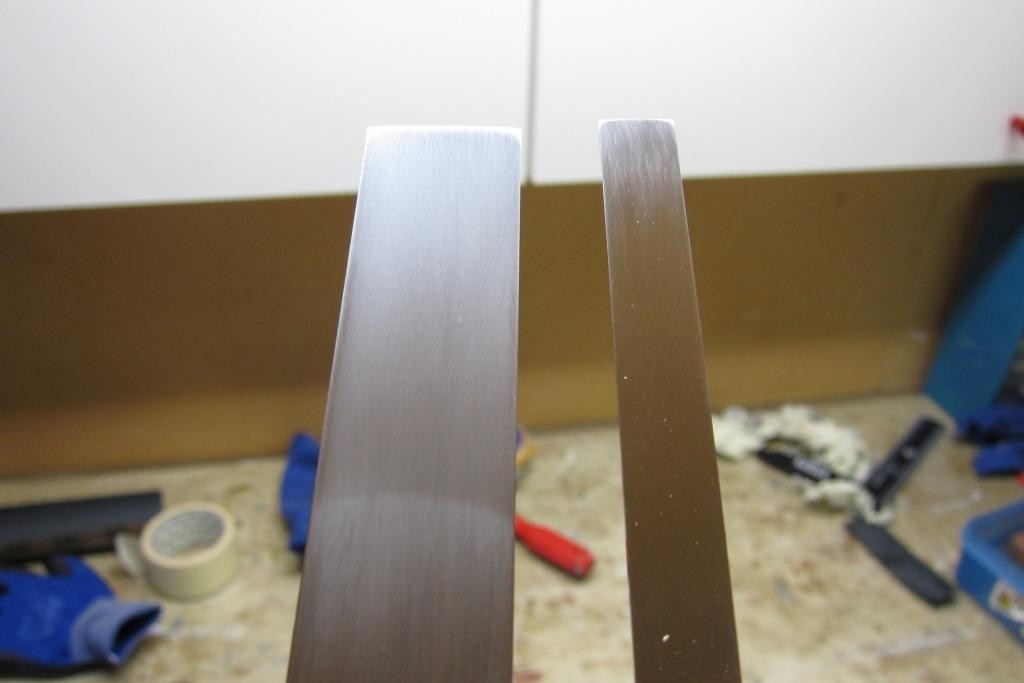 -Slipa baksidan av järnen visade sig bli ett hästjobb och ett jävla slit helt enkelt för mina järn var så långt ifrån "mirror finnish" som det bara går, se nedan.