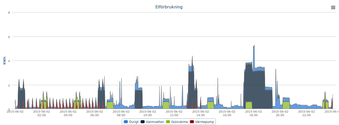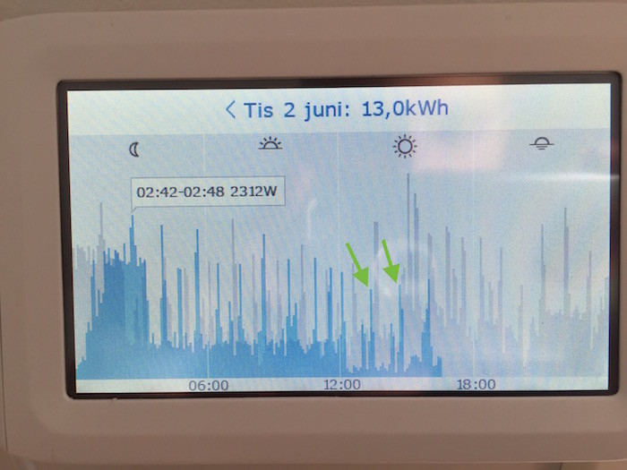Gnuggar mig i huvudet vad topparna i grafen kan vara för de uppstår även t.ex dagar som idag då vi båda varit borta större delen av dagen, enda jag kan tänka är om varmvattenberedaren går igång och underhållsvärmer ungefär varannan timme eller nått?