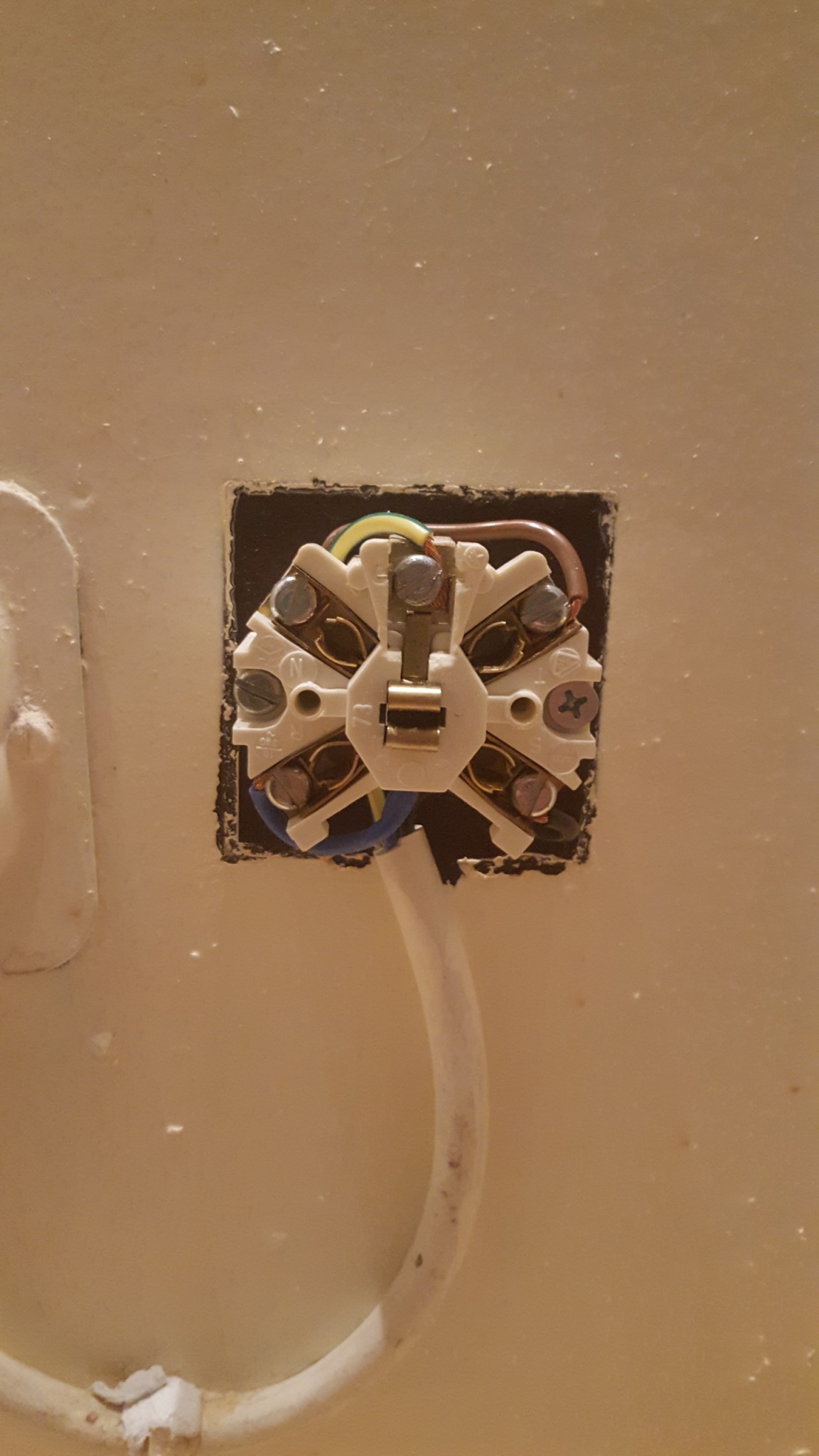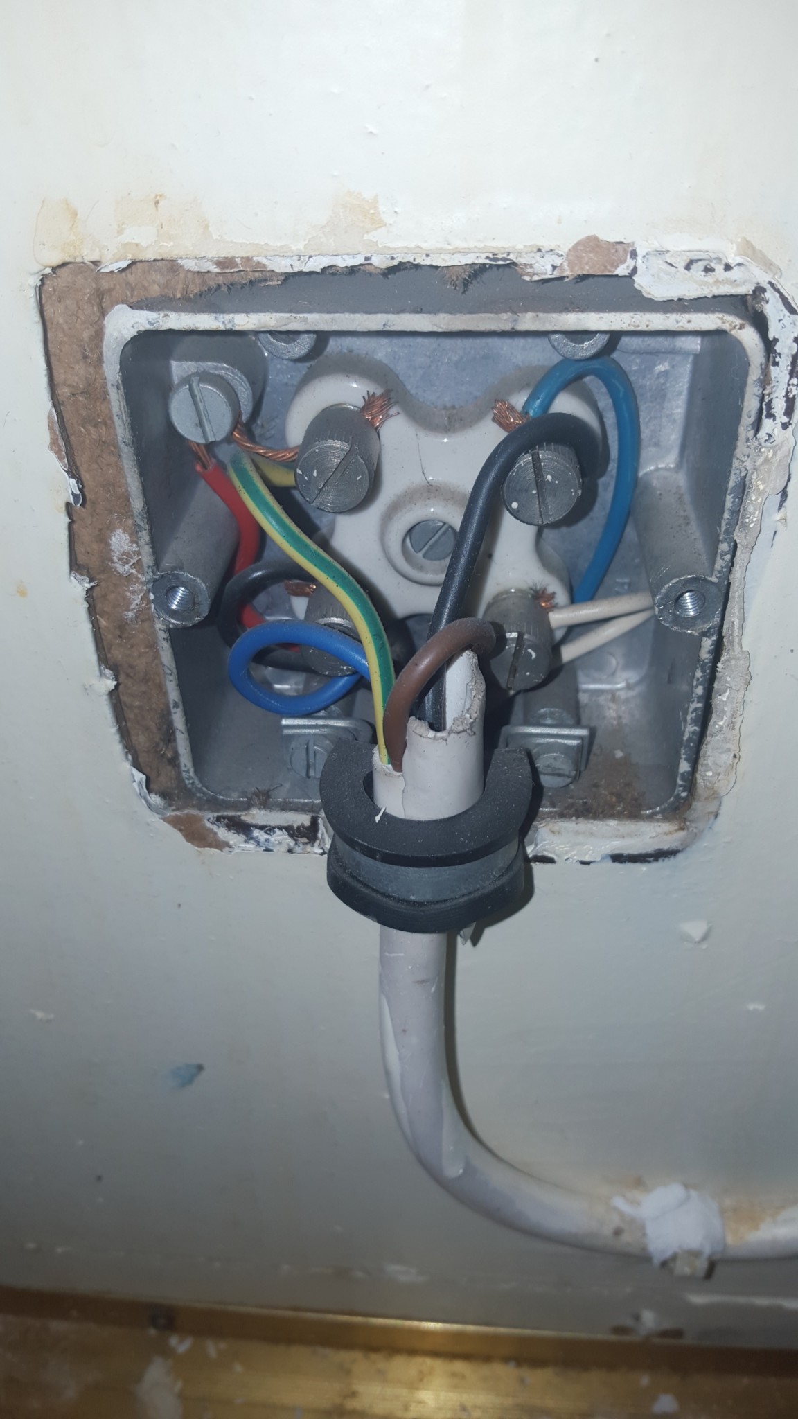 Jag tycker att det ser ut som att den utanpåliggande kabeln är en 4-ledare. Och ingen ledare är ansluten på nollstiftet i perilexuttaget. Den blå är säkert en fasledare. Så du bör ta dit en elektriker.