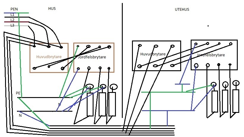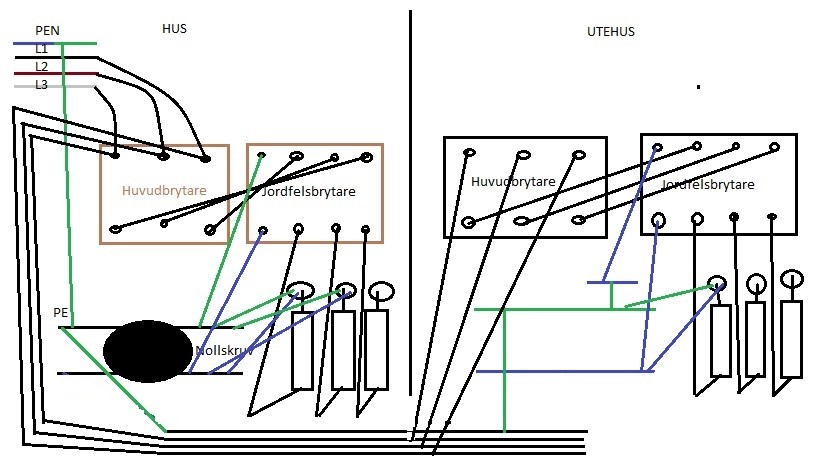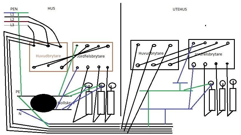 Men det är alltså fyrledarsystem TN-C in i huset. Nollskruven är bortskruvad för att separera nollplint och och jordplint. Sen har man "paralellakopplat" ut till utehuset med ett femledarsystem som jag visade i den första bilden. Sorry för lite röriga bilder. Men jag laddar upp den som stämmer med hur det ser ut idag nu.Nollplint och jordplint är separata i utehuset. Även om det på bilden kanske ser ut som att de är ihopkopplade med strecket jag ritat igenom.
