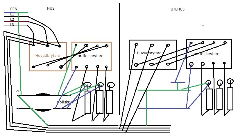 Hans TV gick sönder i uthuset när vi kopplade in den och vi tänker kanske om det kan vara elen det är fel på? Kan någon vara behjälplig att svara på om allt är rätt kopplat? Min son har gjort en enkel bild i paint som vi hoppas ska hjälpa till. Han hade ellära förra terminen så vi kan tyvärr inte fråga hans lärare men Patrik, min son, säger att det ser ut som att jordfelsbrytaren i utehuset är felkopplat. Är det det? Om det är det, kan ni hjälpa oss att berätta om det är något mindre ingrepp så Patrik kan lösa det själv. Vi har verkligen inte råd med elektriker för tillfället och vill samtidigt inte ha dålig el och att hans apparater går sönder. Eller ännu värre att något allvarligare händer med honom.
