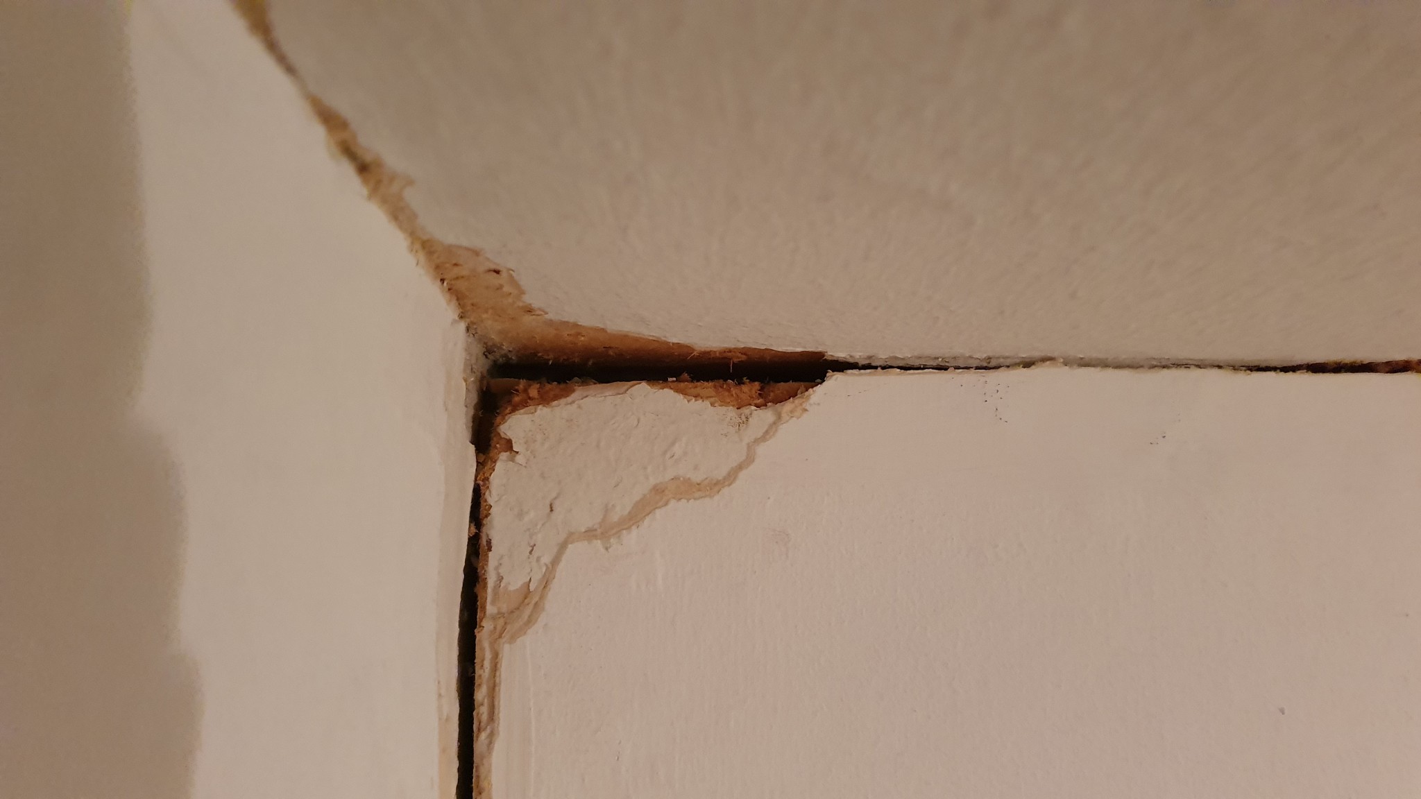 Skulle bara fixa till sovrummet lite snabbt genom att spackla småsprickor och måla men när jag kom till ett hörn så var där plötsligt helt tomt. Efter att jag skar bort allt som satt löst blev det ett hål på 10-15 mm i hörnet mellan vägg och tak och en springa ner längst med väggen på kanske 5mm.
