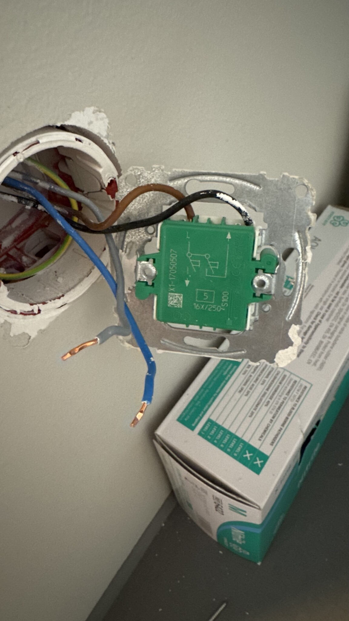 Som sagt du har haft en Plejd inkopplad där, det betyder att en av trådarna är neutral, nolla. Det borde vara den blåa, men den ovanliga trådtypen gör att jag tänker att det kanske är mer som är "ovanligt". Även om det är väldigt sannolikt att blå är nolla, och grå nolla. Som sagt extremt osannolikt att det skule vara tvärtom, men OM det är så att grå är nolla, så blir det en praktkortslutning om den kopplas till brytaren. Risk att både säkring och huvudsäkring löser ut. Inte farligt, mel kanske lite struligt om huvudsäkringen löser.