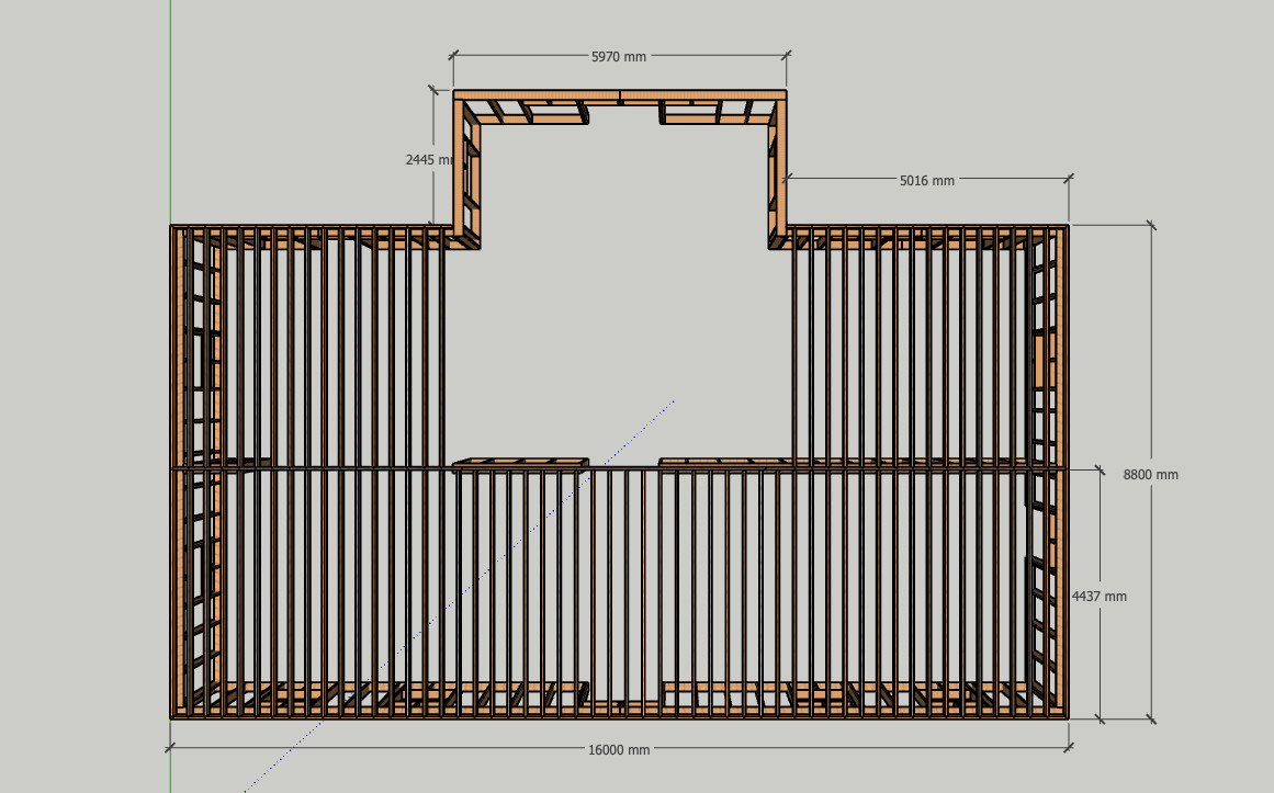 Jag får inte till spännvidderna. Om möjligt skulle jag fortsätta med konstruktionsvirke över sträckan på 5970mm (6m) enligt nuvarande konstruktion. Det blir nog tyvärr för klent.