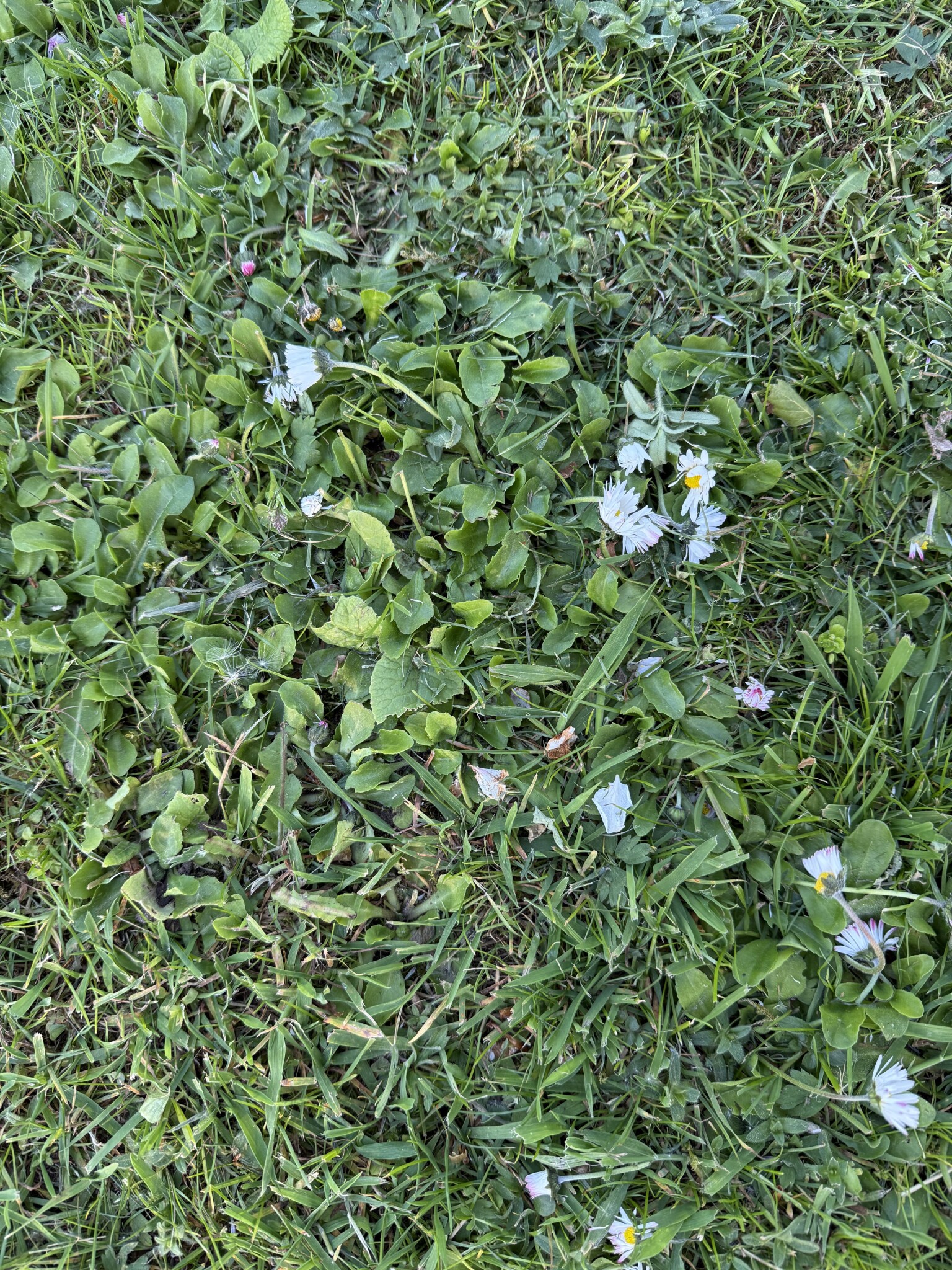 Min gissning är Tusensköna. Den miljövänligaste lösningen är att luka bort det och sen så nytt gräs tex reparationgräs som växer snabbt.