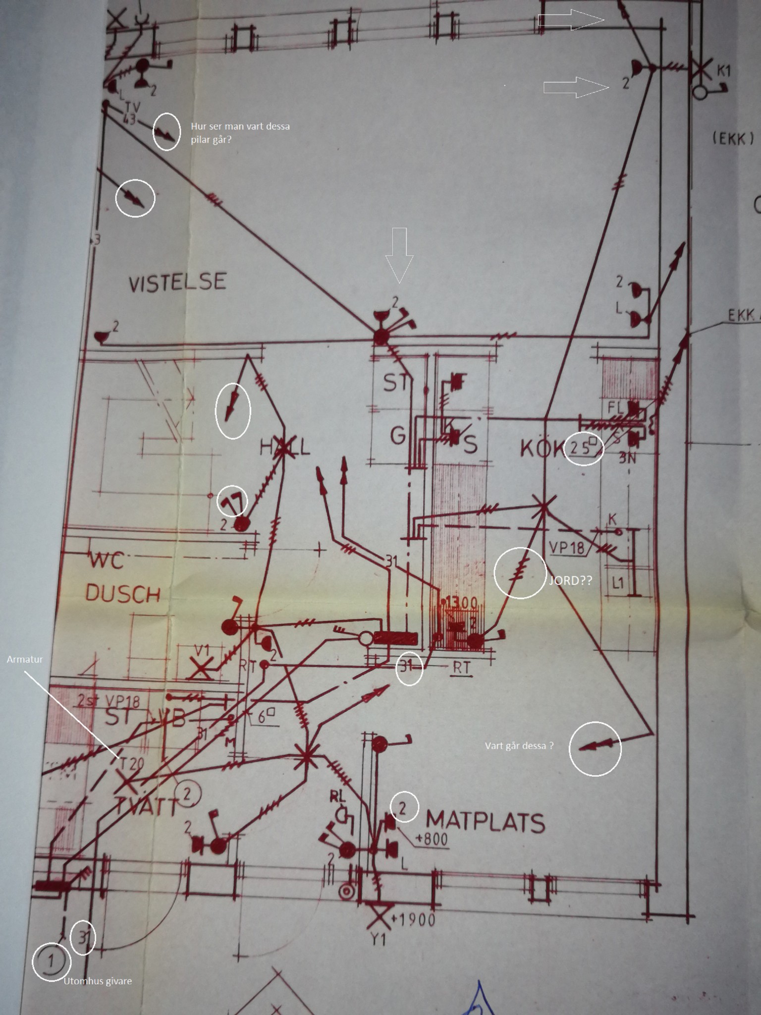 Ja ritningen är från slutet på 80talet, och ja där finns en spis. Men vad betyder alla (2) som finns på ritningen?M Matten skrev:Pilarna markerar generellt sett att ledningen går till ett annat våningsplan. Du bör kunna hitta den på ritningen för nästa våning. Cirkeln med två "flaggor" är en kronbrytare. Har lite svårt att se, men i köket har du circklat där det står 2,5 med en nästan fyrkant ovanför? Bör markera att ledningen är 2.5mm2. Går den till någon spis må tro? Är det en äldre ritning?