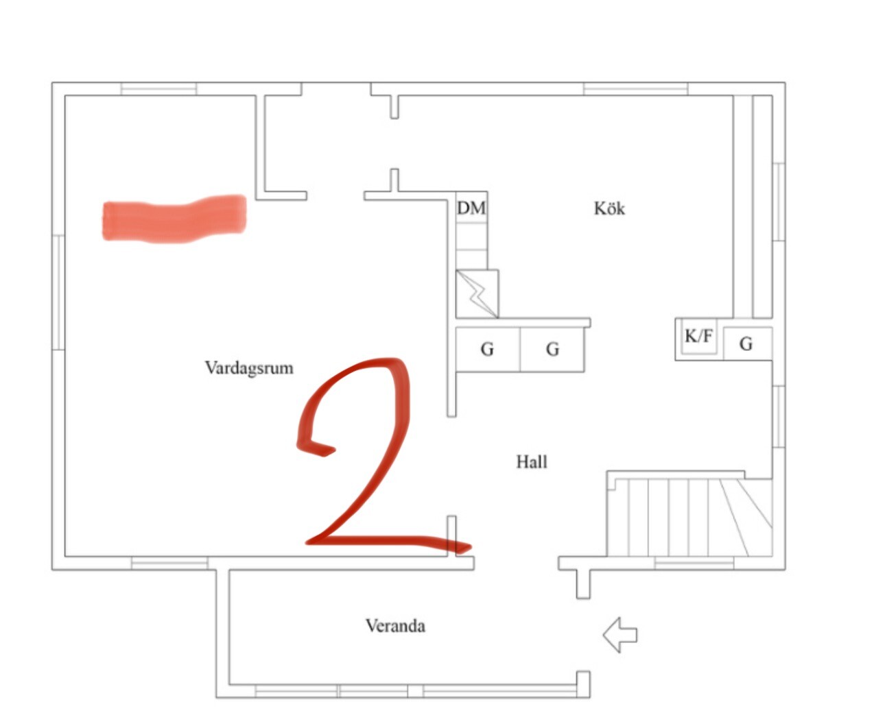 Du har rätt! Enligt säljaren har en tidigare ägare tagit bort en bärande vägg (den som är rödmarkerad) och gjort en avväxling. På bild nummer 2 ser man hur det ser ut idag, efter att väggen mot garderoben tagits bort – det utrymmet är nu en matsal.BirgitS skrev: