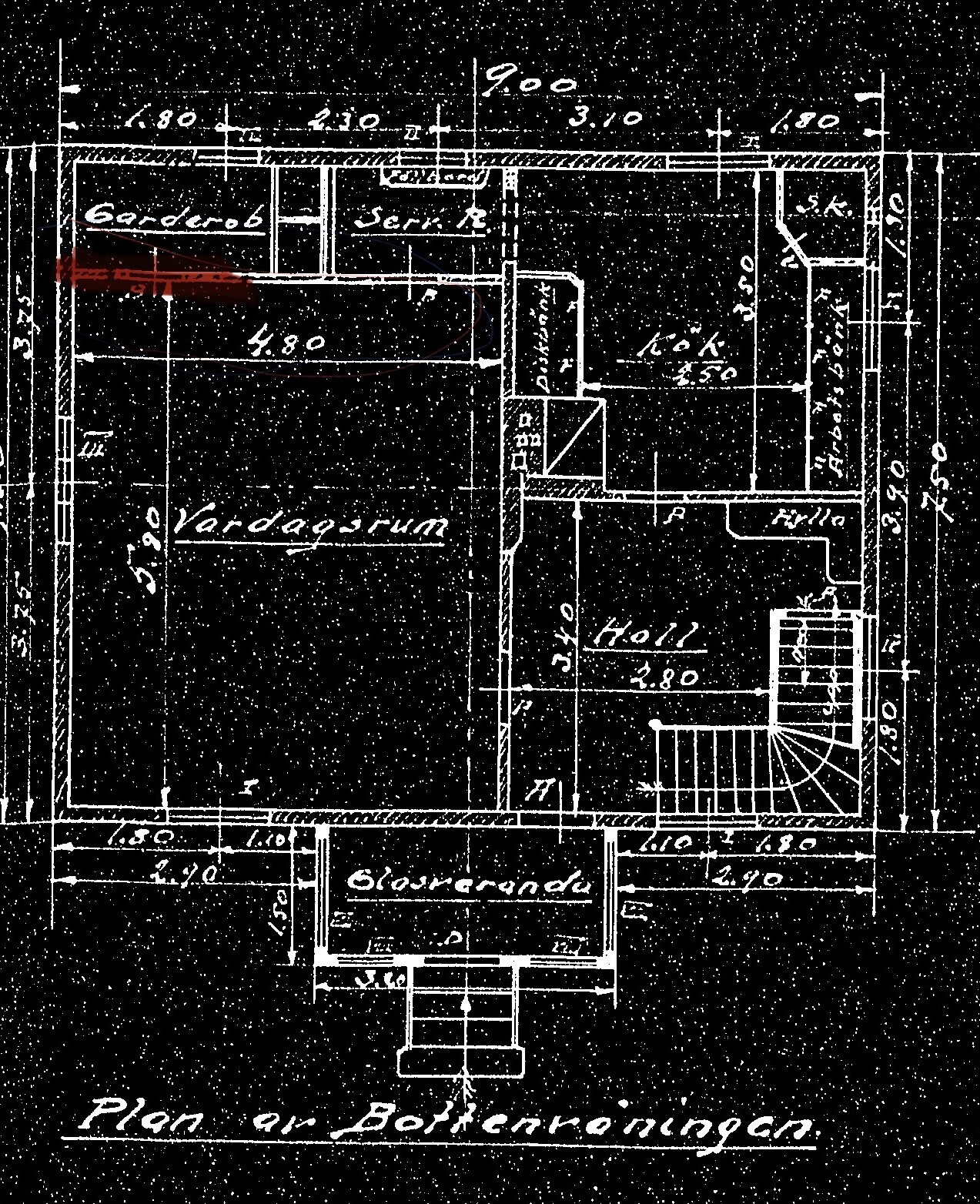Jag har bifogat originalritningar på huset. Enligt säljaren har en tidigare ägare tagit bort en bärande vägg (väggen mot garderoben i hörnet av vardagsrummet, vet inte hur en sån vägg kan vara bärande?!) och gjort en avväxling där.