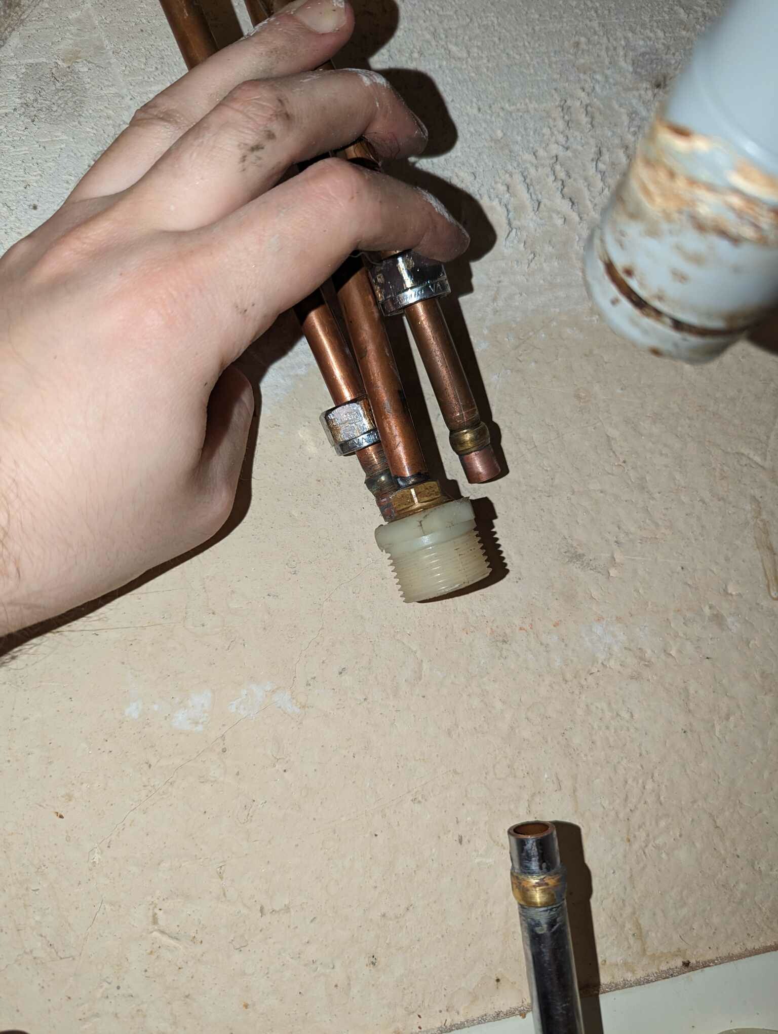 1. (Bild 1, rör till nuvarande blandare) Hur får jag bort den gamla blandaren? Har skruvat loss allting jag kan, hålet i diskbänken är så pass litet att inget utom dom tre kopparrören kommer igenom det. På bild 1 är nuvarande blandares kopparrör, dom har en liten knöl i botten som gör att man inte kan få bort muttern som sitter ovanför. Jag har svårt att se hur jag ska få muttern genom hålet i diskbänken, men på något sätt måste den ju ha gått in där en gång i tiden.