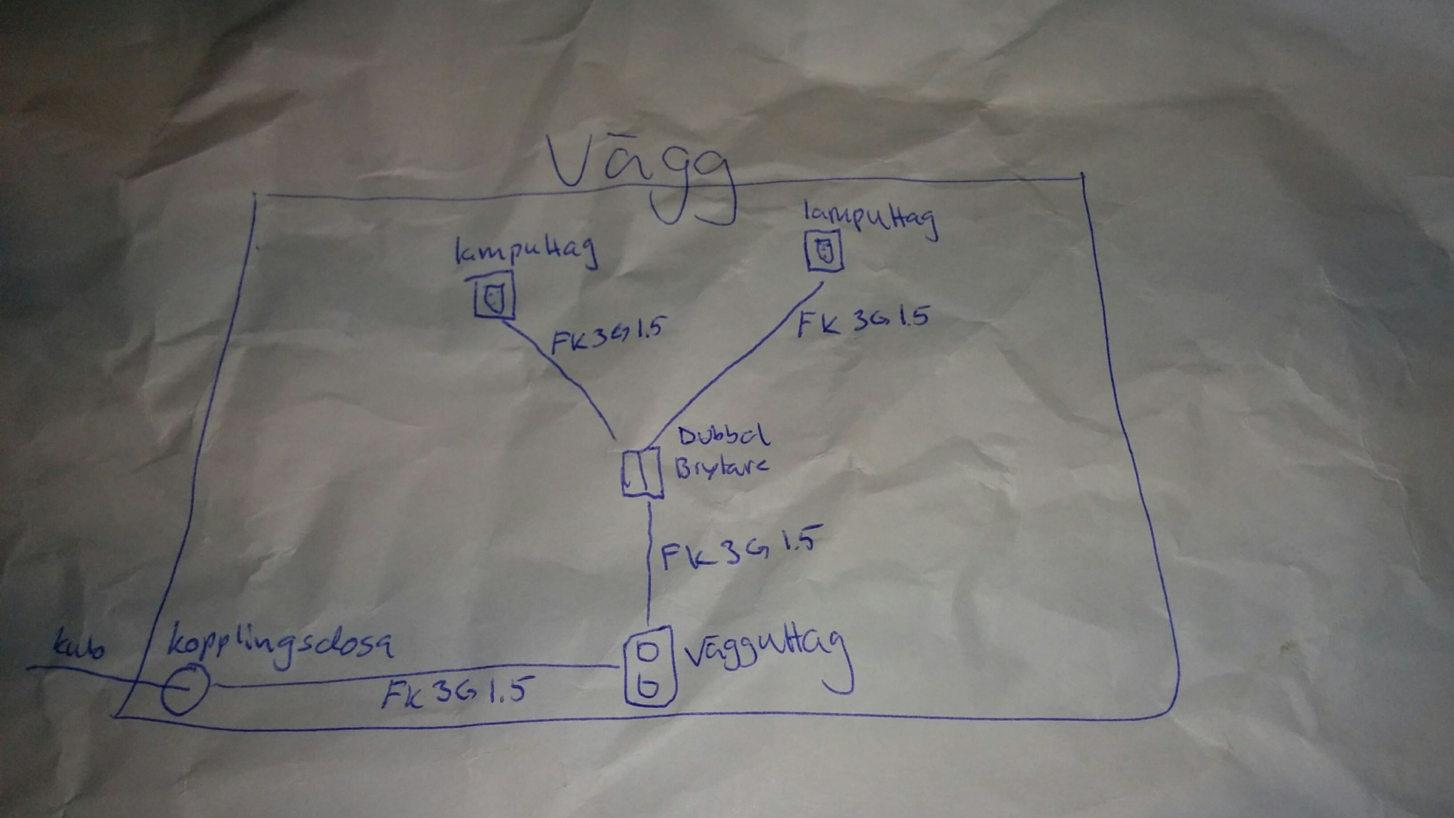 Men lamputtagen är ju apparatdosor? Inte k-dosor.tommib skrev:Det funkar som du har ritat, men man drar normalt inte så. Vanligen kommer man in via ett av lamputtagen (som alltså är en kopplingsdosa) och sprider därifrån. Om nu förutsättningarna är så att du har en befintlig matning som kommer i golvhöjd som du inte kan flytta på går det bra att göra som du ritat. Du bör dock tänka på att en kopplingsdosa måste sitta med skruvat lock om den sitter under 170cm höjd. Jag skulle inte sätta en K-dosa alls där utan sätta ett uttag istället, för att slippa få ett blindlock på väggen.