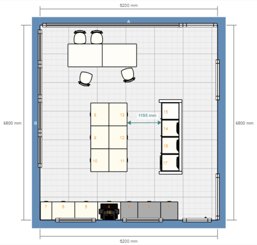 Föreslår att du utökar avståndet mellan högskåpen och köksön till 120 cm så att det inte blir något krångel med bygglovet. Det måste nog också vara 120 cm mellan skåp 1 och täckskivan/väggen bredvid nummer 17, liksom mellan hällen och köksön.