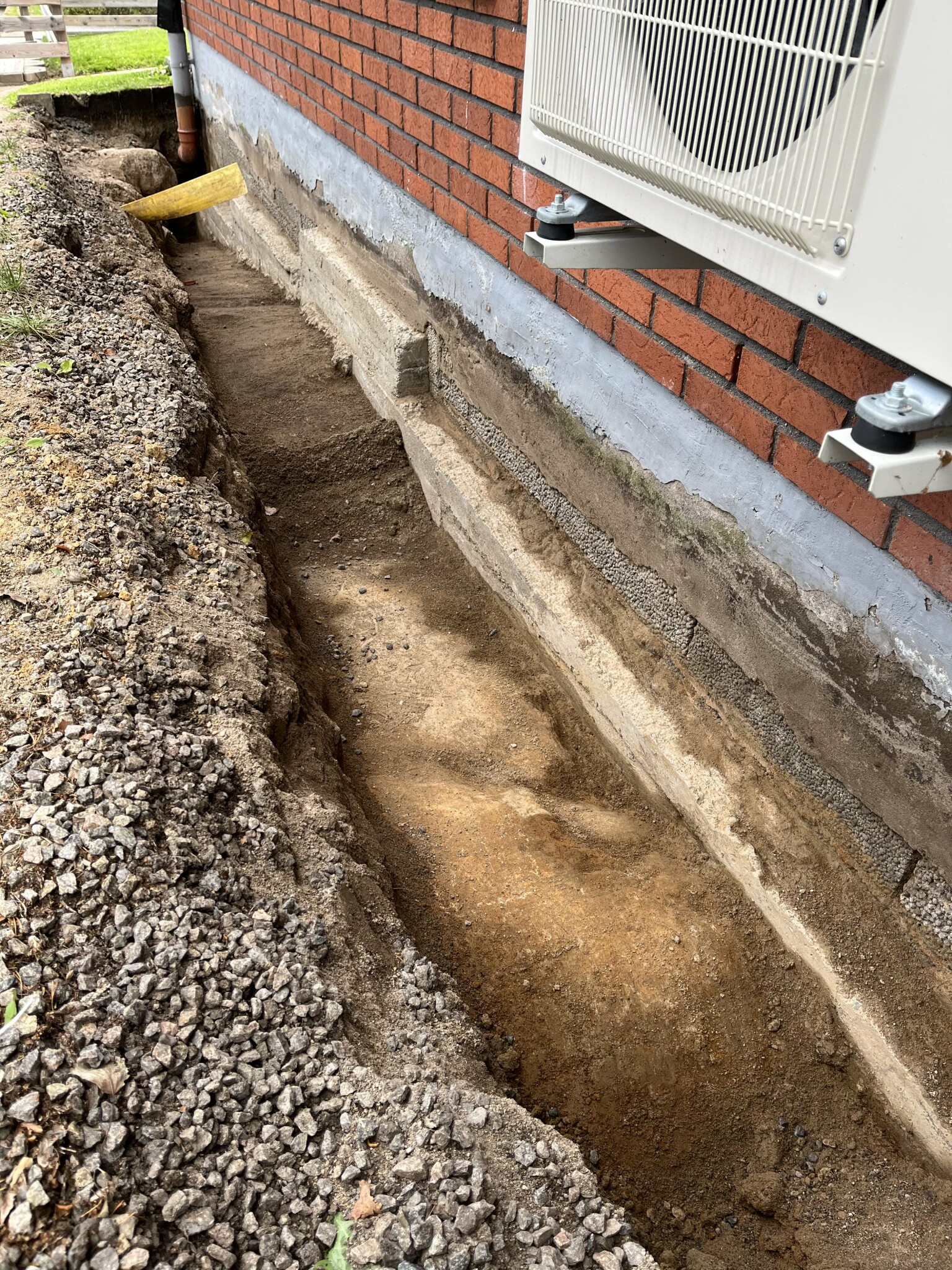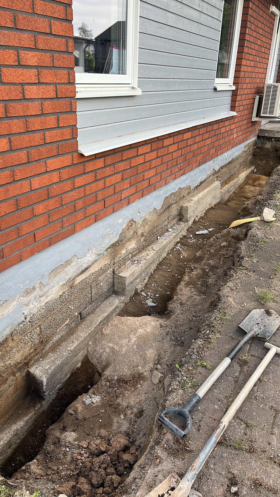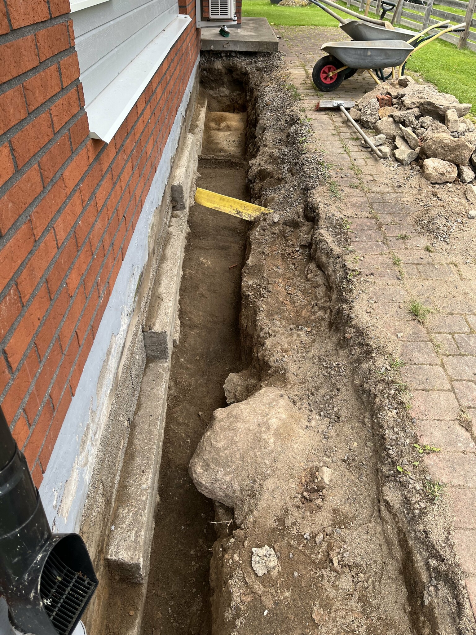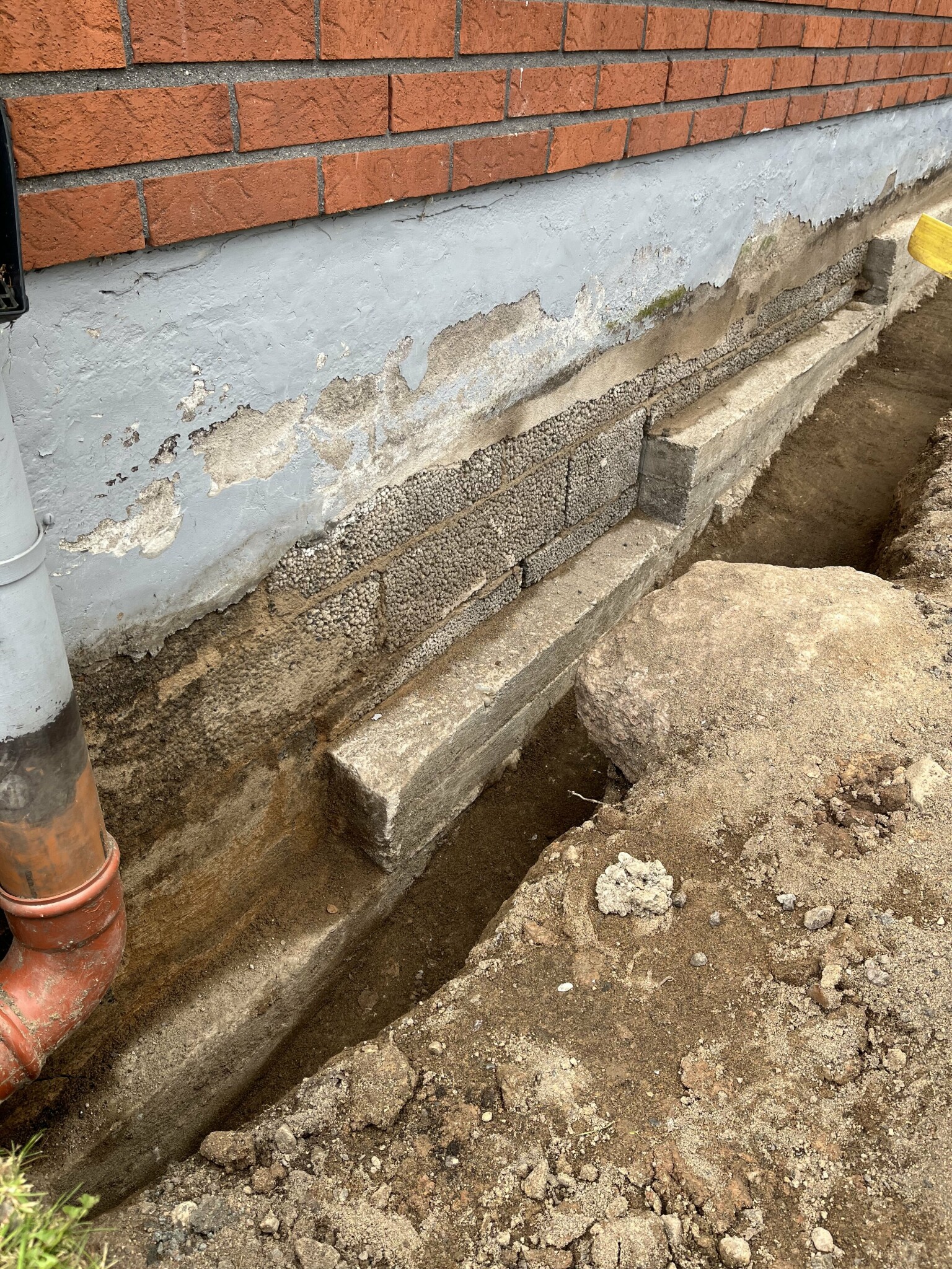 Hej jag har ett hus som är platta på mark från 1977, det som har bekymrat mig är att jag har ventilations galler i husgrunden. Vad vi har kunnat listat ut än så länge så är plattan gjuten över lecablocken och lämnar ett rum mellan plattan och berget som det står på. Därav antar jag gallren ? Jag misstänkte fukt längs husväggen så jag började gräva och upptäckte att under 1dm singel låg det ren sand som var aningen fuktigt. Jag har tänkt sttt ersätta detta med singel, eller tänker jag fel och behöver göra något helt annat, har frågat fackmän och bygghandlare men ingen kan ge mig ett vettigt svar då de inte sett denna typ av platta på mark. Vad ska jag behandla grunden med? Se bilder
