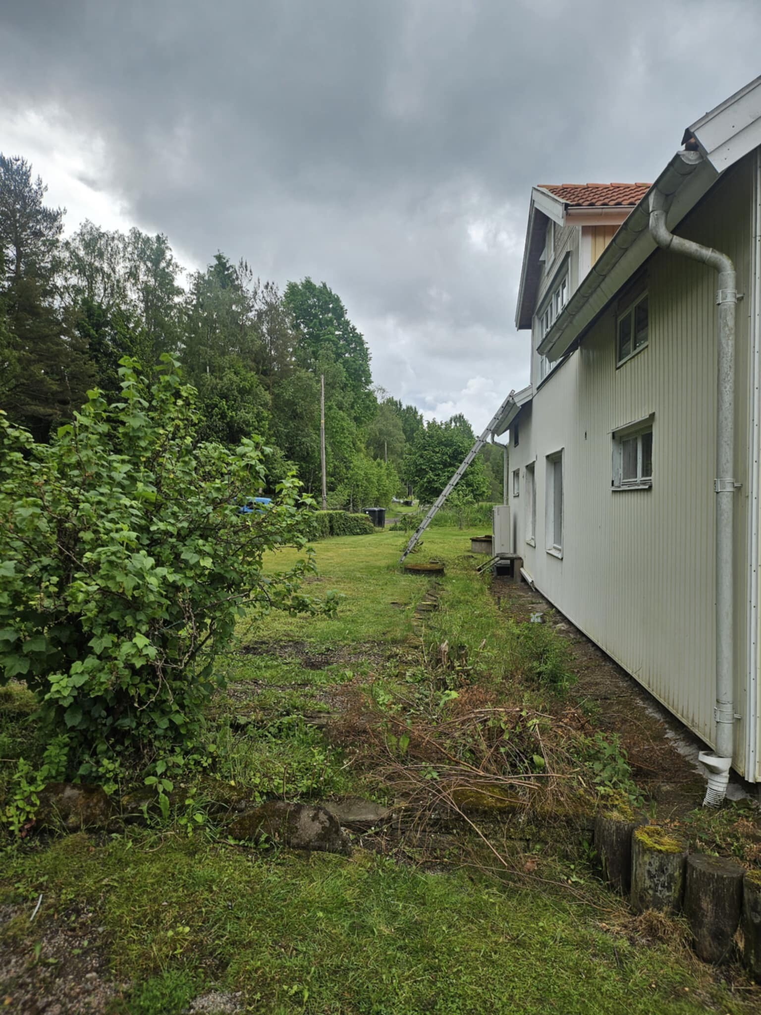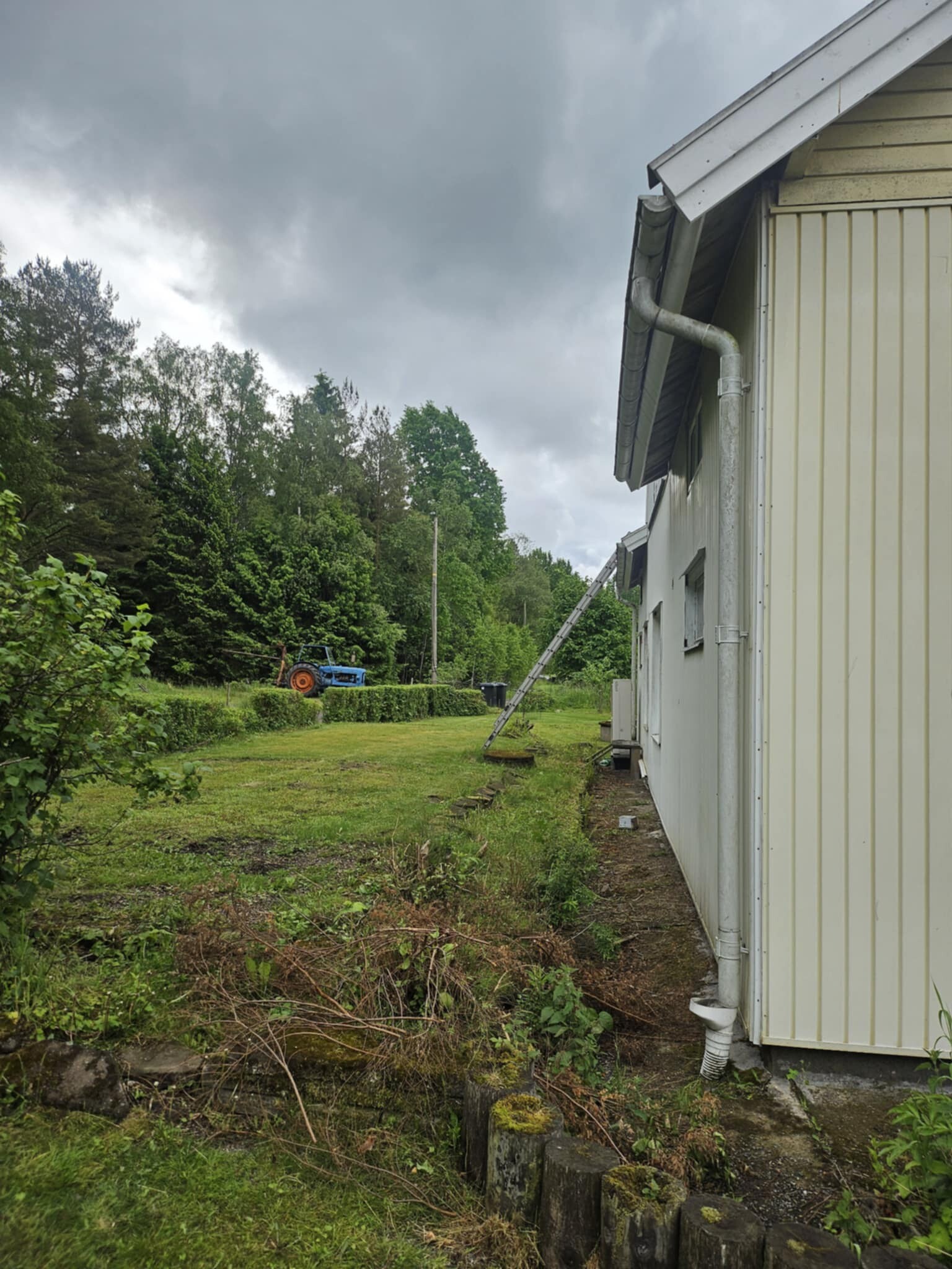 Därefter går de upp med gamla telestolpar till lite högre marknivå. Vi funderar på om man ska schakta ner hela gräsmatttan så den är i nivå med resterande mark. Men huset ligger då lägre än vägen och vi tänker på om man bör bygga en ”vägg” av något slag med någon dränering. Nästa fråga är då om de vore bäst att schakta ner allt eller bara en bit.
