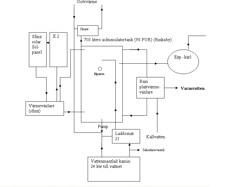 jag har igentligen inte gjort någonting åt den, mer än att vänt utloppet mot skortsenen. Som förövrigt är toppansluten. Tanken bakom det är att vattnet skall förångas ifall något sker. Därimot tror jag inte att det är och blir några problem, eftersom jag har 120 liters expansionskärl. Detta blir inte särskilt varmt heller när temperaturen ökar i systemet, så jag hade säkert kunnat använt mig av ett mindre, men säkerheten räknas ju ganska högt, därav det stora kärlet.