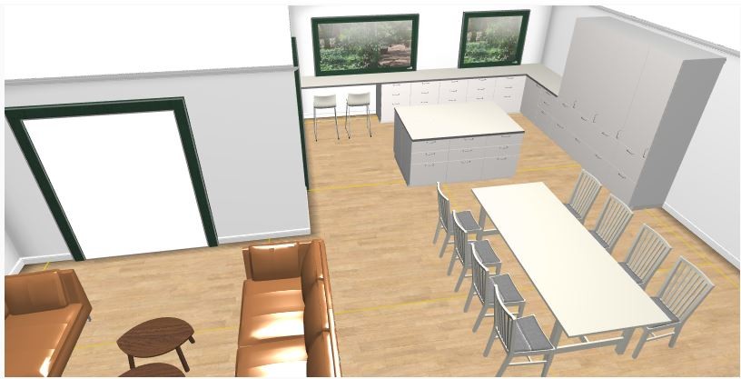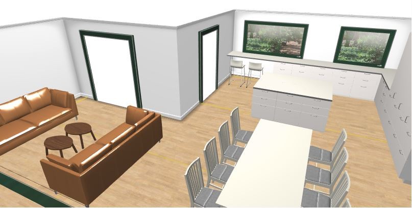 Sätt ett L-kök från kök till matplats. Ta all yttervägg i anspråk och ha stor öppen yta i mitten. När man sitter ner kommer man är se över köksbänken ut genom fönstret.