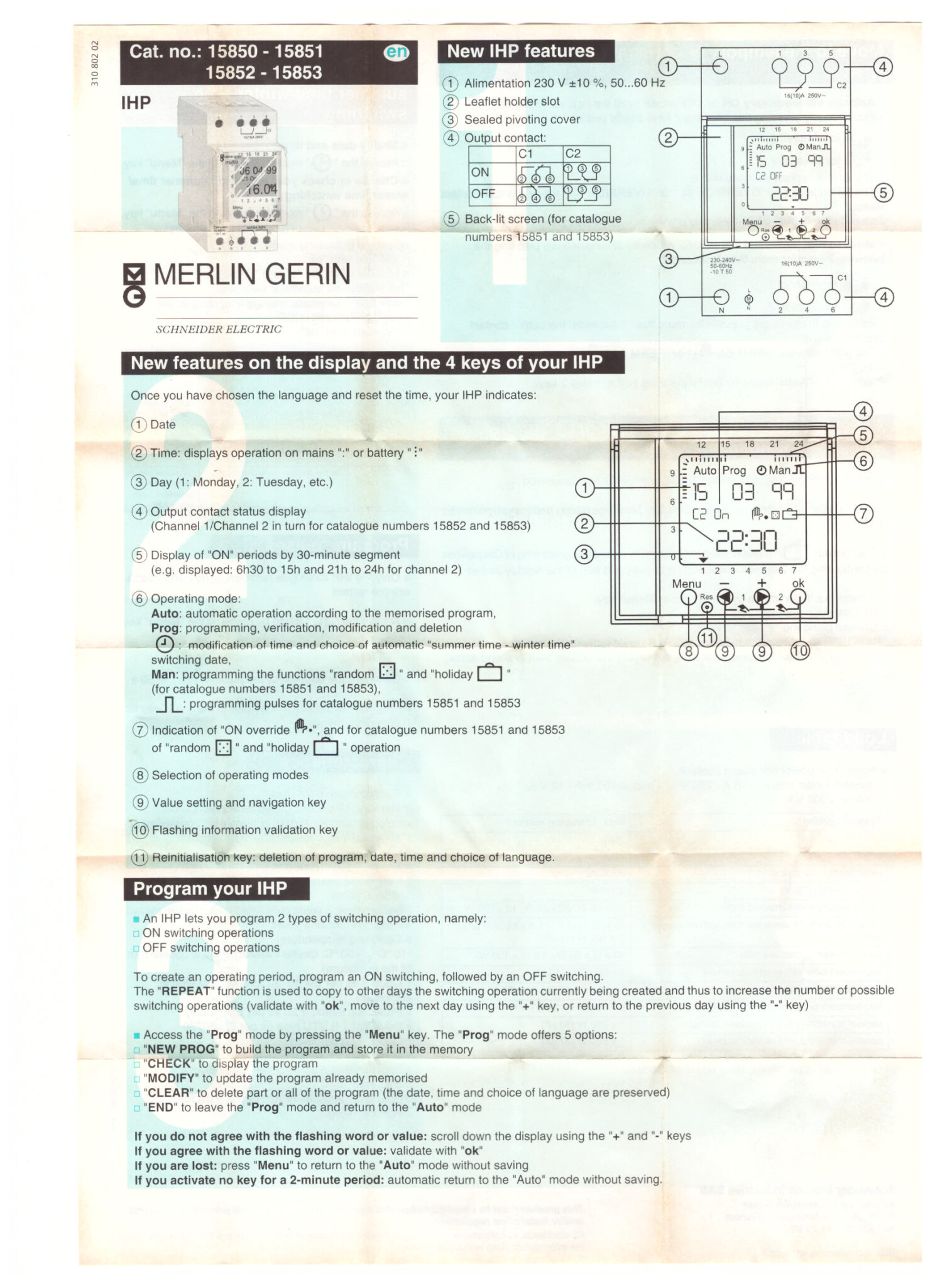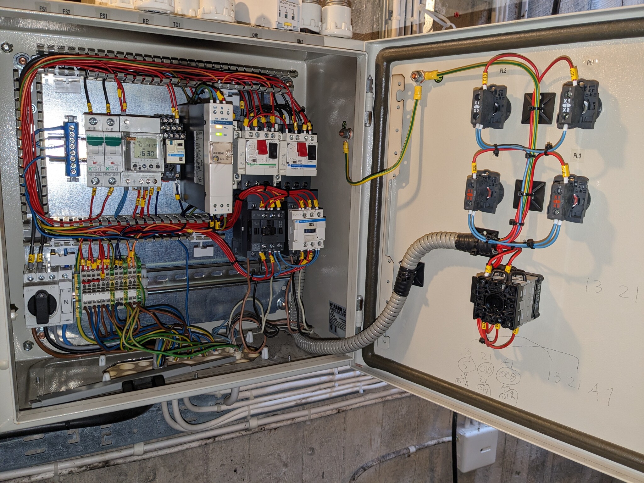 Tryckströmbrytaren är kopplad in i en MERLIN GERIN 15850 ,manual bifogad, som jag inte riktigt förstår hur den ska funka, men jag tror att det är den som strular. Den går sedan ut till två st motorskydd+kontaktorer som i sin tur styr varsin pump (A/B). Tanken är att bara en av pumparna ska gå och 15850:an ska välja vilken när tryckbrytaren är i på läget. Men den slår inte igång kontaktorn vad det verkar trots att tryckbrytaren tydligt slår till när trycket sjunker under 2.5bar. Jag kan köra pumparna manuellt genom att trycka in den lilla knappen mitt på med en skruvmejsel och på så sätt få upp trycket i hydroforerna, och det gör jag nu typ en gång i timmen (under peak) så att folk ska ha vatten till dusch och matlagning.