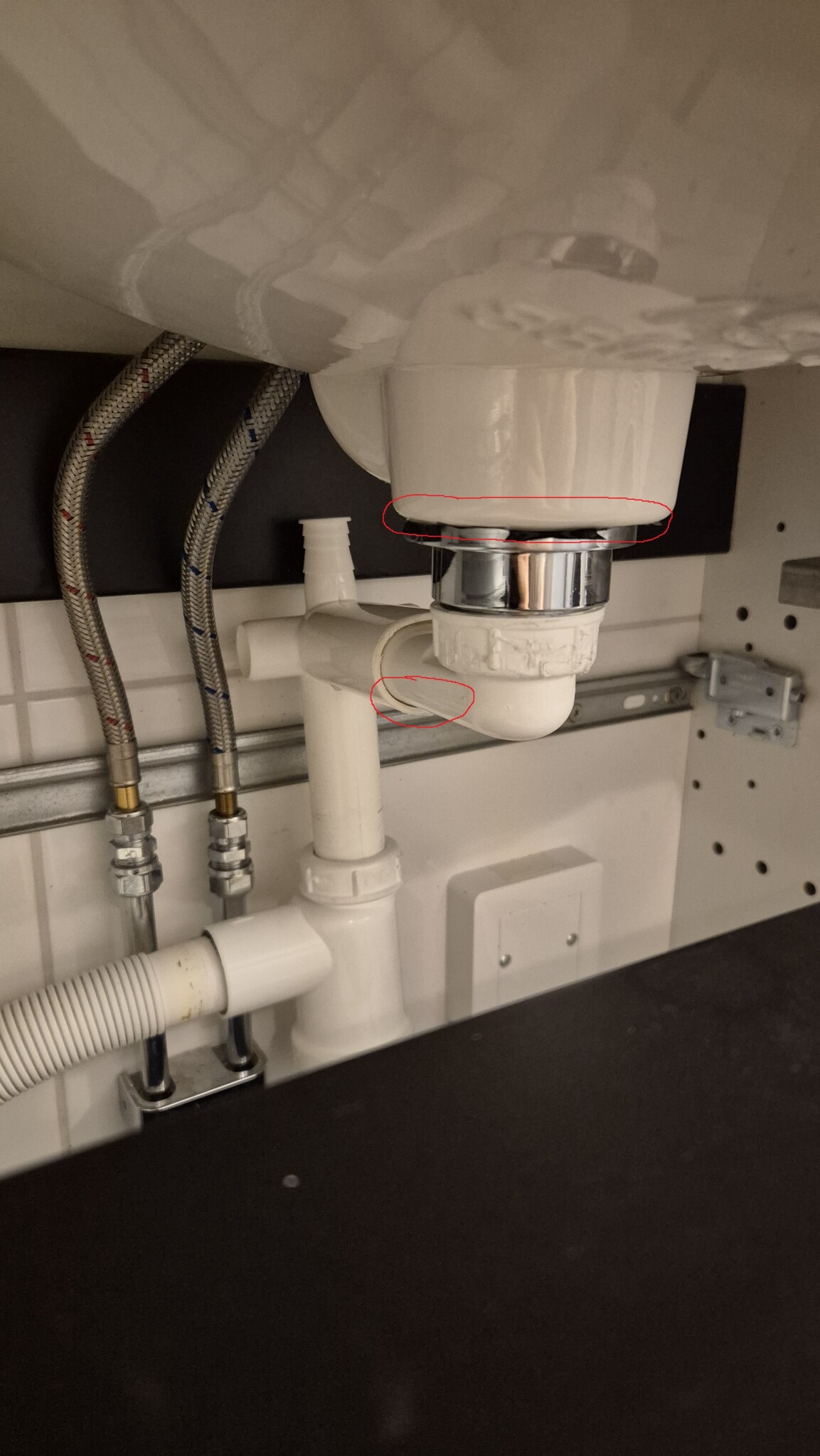 När jag monterade ihop senaste gången började det läcka från den övre röda cirklen. Jag gick till bauhaus och köpte på rekommendation en skumgummibit som sitter mellan "metallbiten" och handfatet i sig. Men det läcker trots det.
