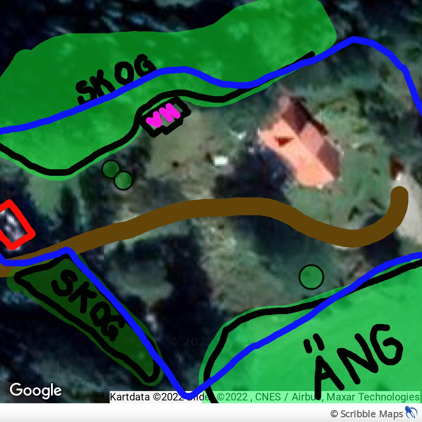 Formen med de rosa bokstäverna är det tänkta växthuset som då skulle hamna med ena långsidan i sydöstlig riktning och den andra långsidan mot en skog. Den blå linjen är tomtgräns vilket också visar var vi potentiellt kan ta ner träd. De gröna cirklarna är lite större lövträd. På den platsen skulle växthuset få sol från ungefär 9.30 på morgonen och sedan få sol fram till ca 17 med lite växlande skugga under dagen pga lövträd på tomten. Är det generellt sett möjligt att placera växthuset med skog på ena sidan (avståndet kan anpassas från 1m till ca 5m) och i den tänkta vinkeln?