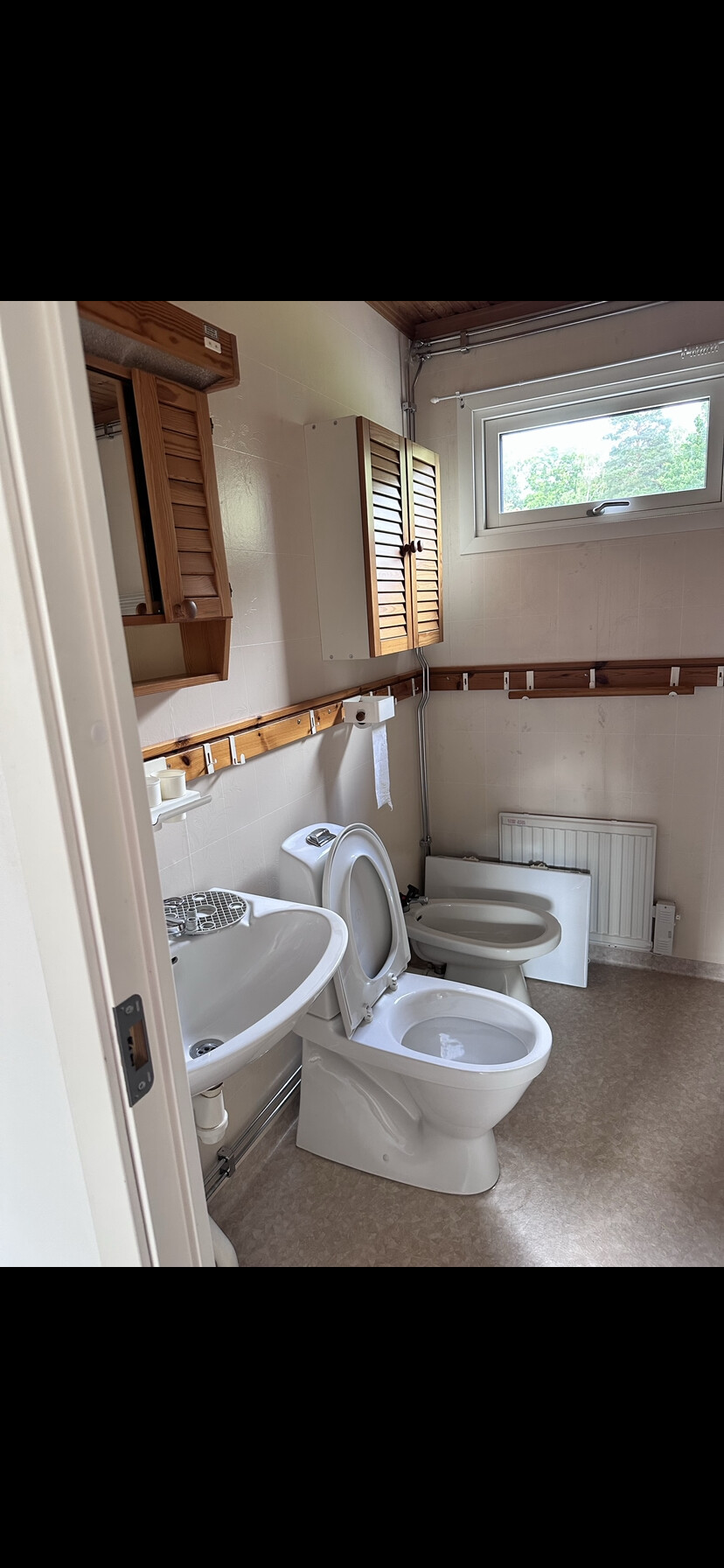 Nuvarande skåp med jalusiluckor ser ut att vara från Svedbergs kring 1980, i alla fall är spegelskåpet väldigt likt det från Svedbergs som fanns i ett hus byggt 1989, men då hela luckor och vitlackat.