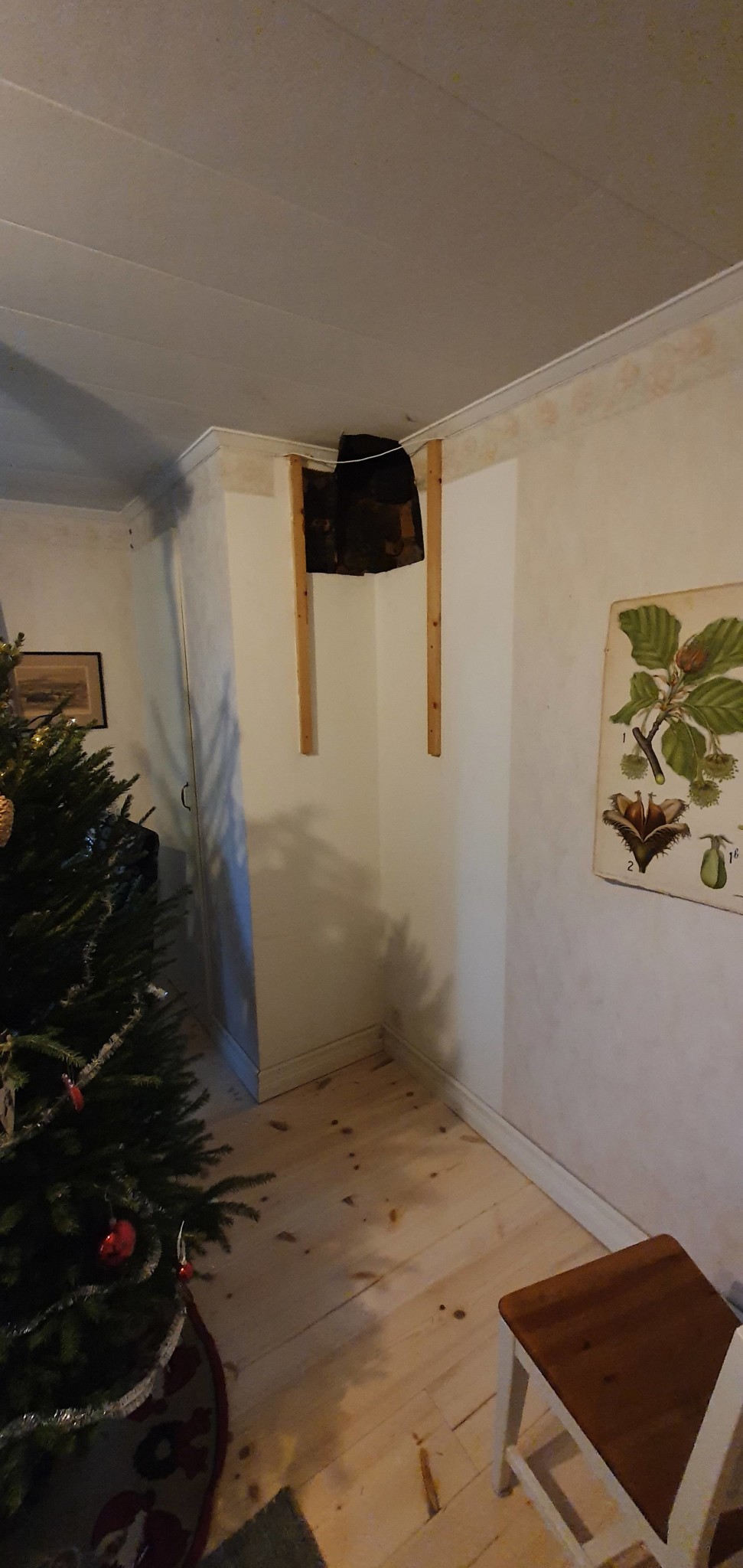 Den gamla kaminen gick via ett hemmabyggt svetsat stålrör upp i murstocken i ett 150mm hål. Problemet är att hålet I murstocken är rakt uppåt (en gång i tiden vedspis) och ligger ca 255cm över golv ( 15cm ovan innertak ) och ca 10cm innanför innervägg.