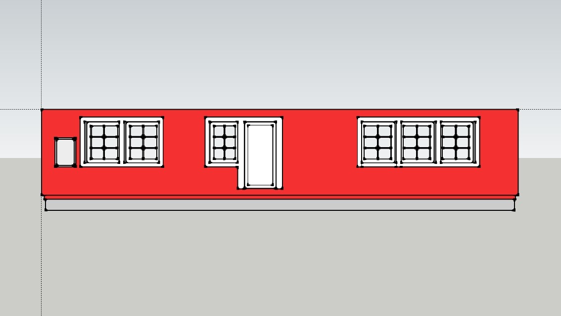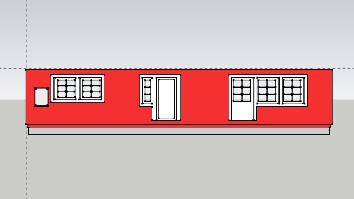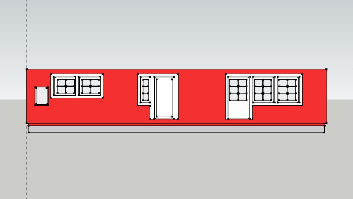 Innanför de två fönstren till vänster finns köket, mitten är hallen och de tre till höger är vardagsrummet. De stora fönstren är idag 11x13 och det lilla 9x13. "Lådan" längst till vänster är ett elskåp som jag tog med eftersom det idag linjerar med underkanten på fönstren.