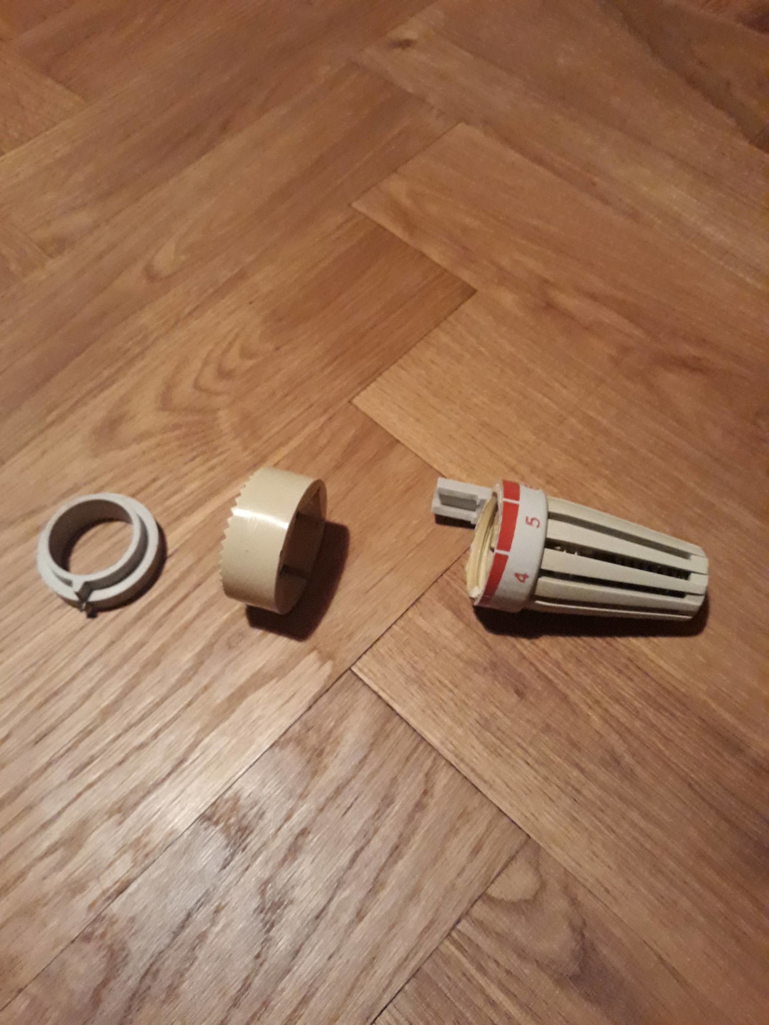 Har även en termostat som inte har gått sönder ännu, där man även ser mellandelen som saknas på den termostat som är trasig.