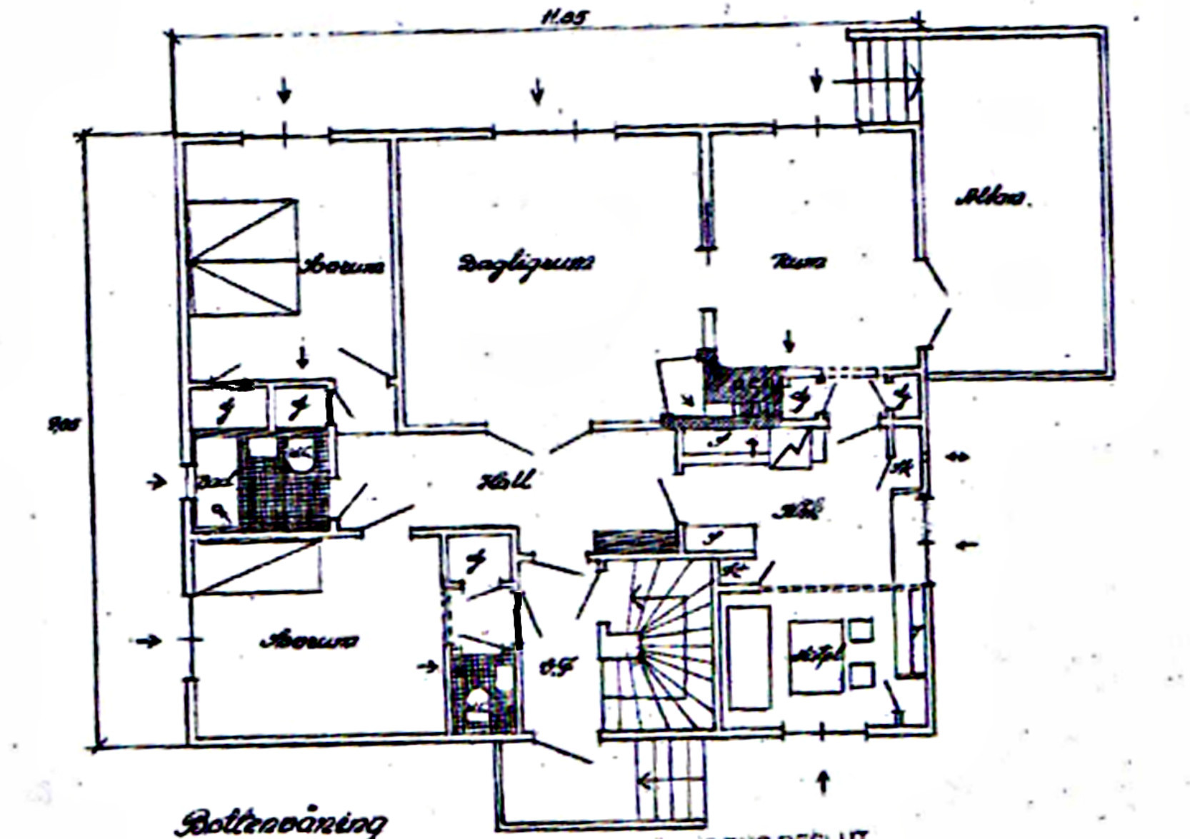 Bilden är inte så bra då jag inte fick till skanningen riktigt. Men måtten är 9,85x11,85meter. Trapphuset hör inte till lägenheten utan är trapphus upp till våning två och ner till den gemensamma källaren. De två garderoberna som syns vid badrummet är utblåsta och är numera del av badrummet. Dörren som syns mellan trapphus och rum till vänster är igenbyggd. Utbyggnaden jämte sovrum uppe till höger är altan.