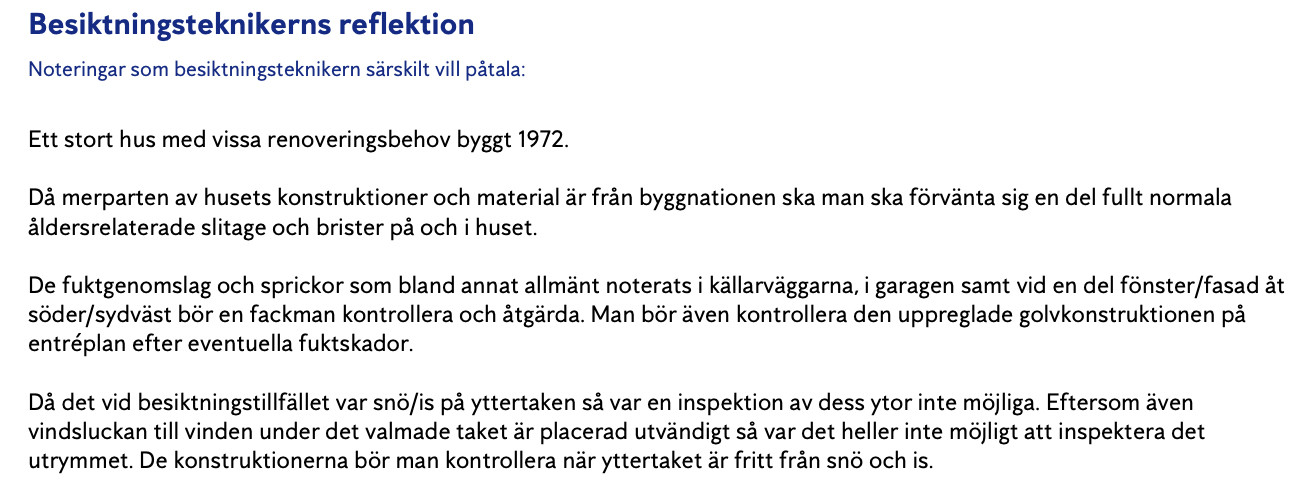 Vi är ett ungt par som sedan ett par år varit i jakt på hus och varit runt på en del husvisningar - därigenom lärt oss litegrann om hur man tolkar besiktningsprotokoll. Nu ska vi på visning på ett objekt med fantastisk potential MEN där besiktningsprotokollet från Anticimex verkligen har satt oss i funderingar - bland de sämsta vi sett.. Ingen av oss har ägt eller renoverat hus tidigare. Huset är byggt på 70-talet med den tidens standard rakt igenom. Det enda som har bytts är papp på tak och att man satt in luftvärmepumpar (vg se bilder).