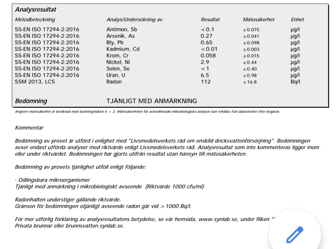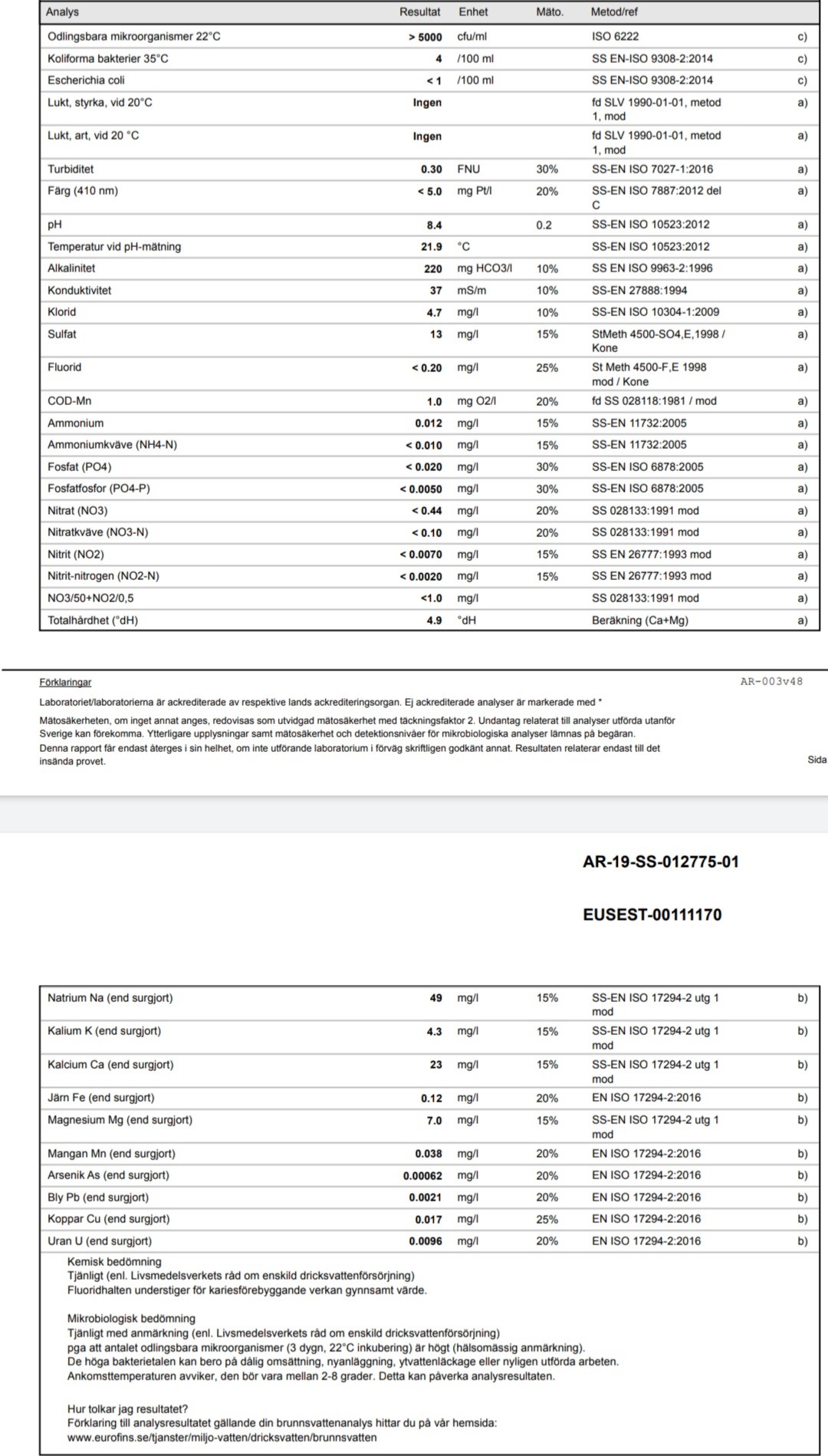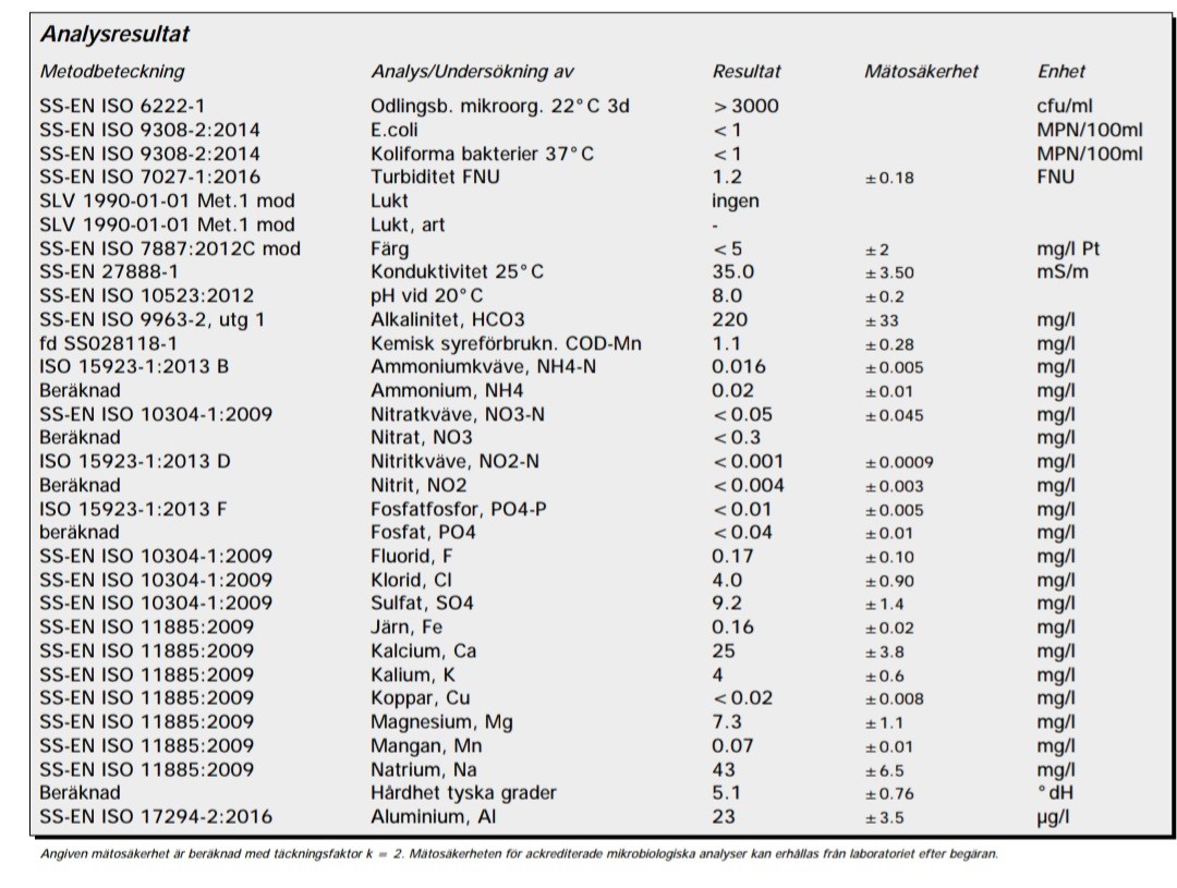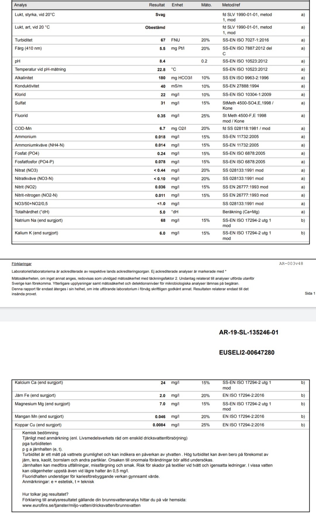 Analysresultat från prov taget i nyborrad brunn juni 2019 (eurofins)