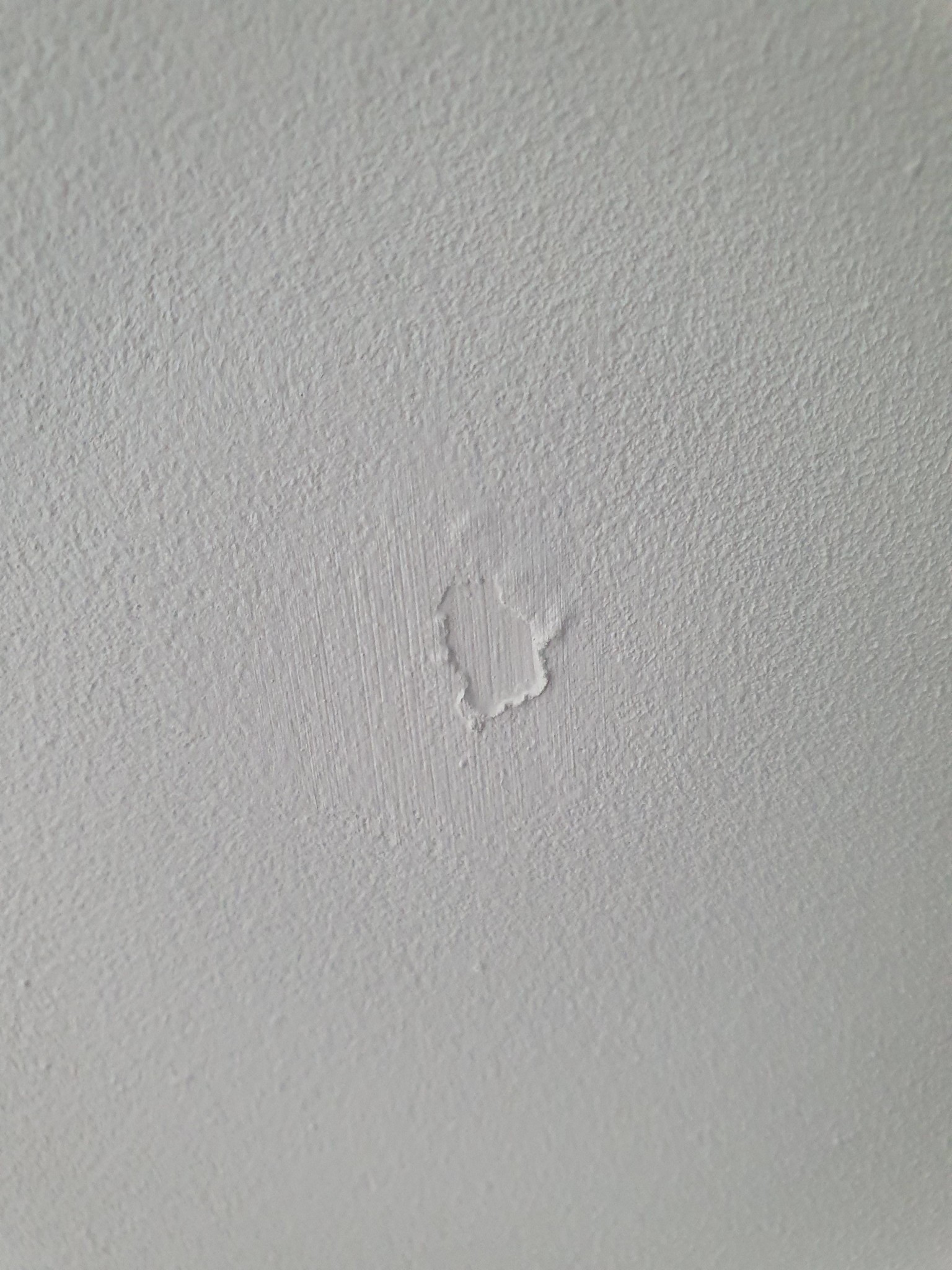 Se om du kan slipa till kanterna lite, spackla försiktigt, "dutta" lite i det våta spacklet med ett hopknölat papper för att få till strukturen. Måla det spacklade två gånger.