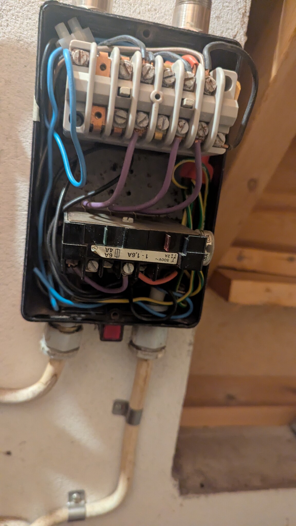 Det är en äldre anläggning med en 150 liters galvad tank från 1967, fin årgång 🙂. Motorskydd tryckströmbrytare och huvudbrytare är också modell äldre.