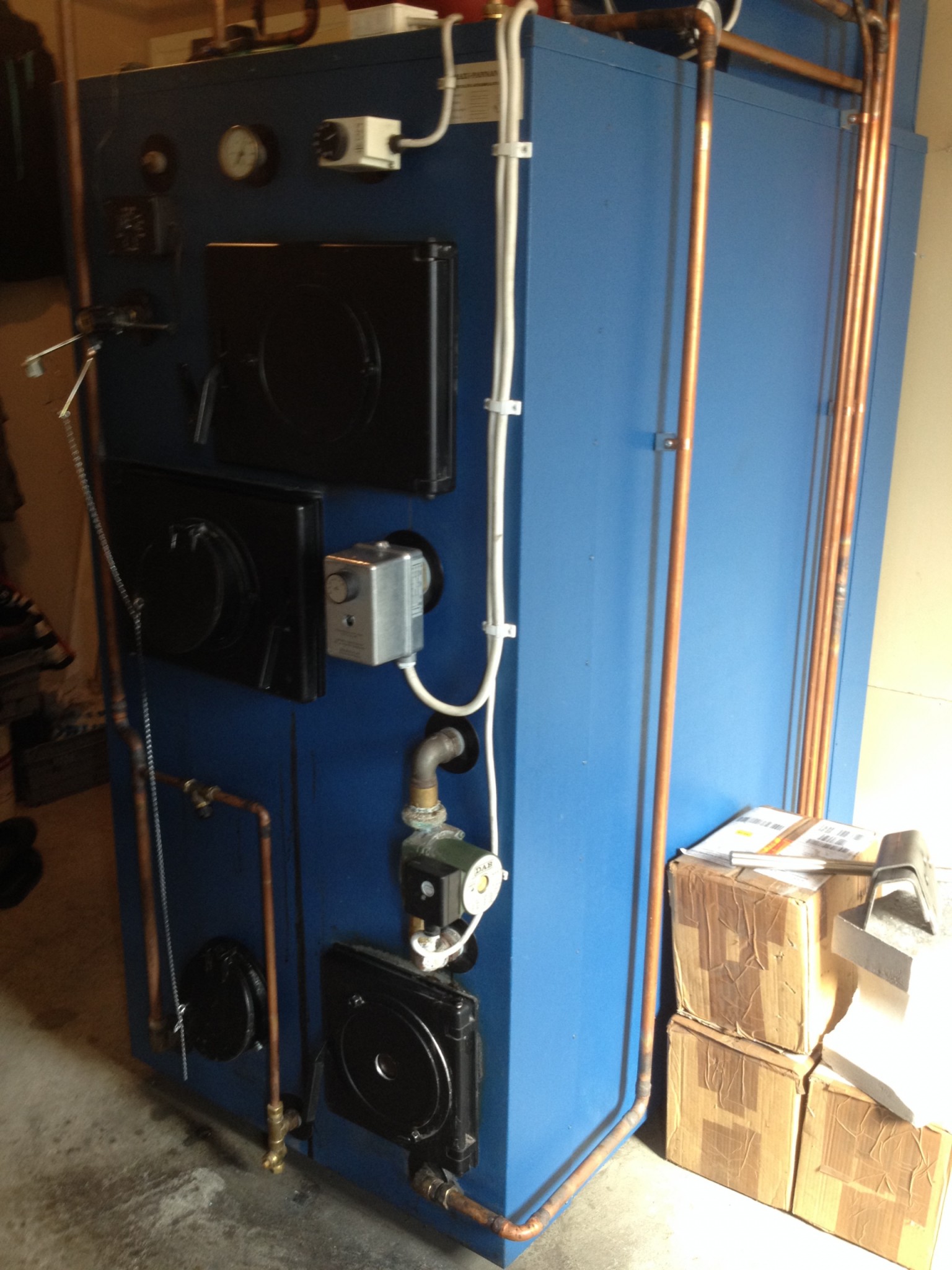 I garaget står vedpannan ( Maxi50 ) se bilder för info. Från garaget har jag grävet ner en Pex kulvert med längden 18meter till huset. Husets våningsplan är c:a 2m högre än garaget.