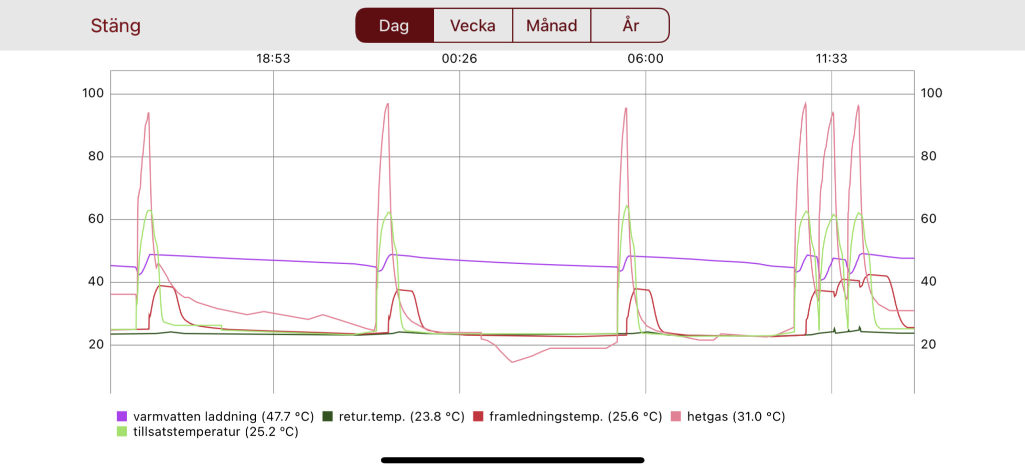 Tror att elpatronen har gått kraftigt. Förstår att det nu inte är rätt tillfälle att ställa in pumpen men funderar över ett par saker utifrån det jag har sett hittills.