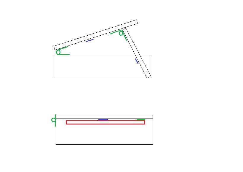Ett alternativ för att hålla upp luckan är en låsbar hasp i framkant på luckan med en ögla i lådfronten för att låsa luckan när den är stängd (onödigt) och en ögla i taket som ni haspar den i öppet läge. (Varför tänker jag på Emil och snickarboa när jag skriver detta... :-D)