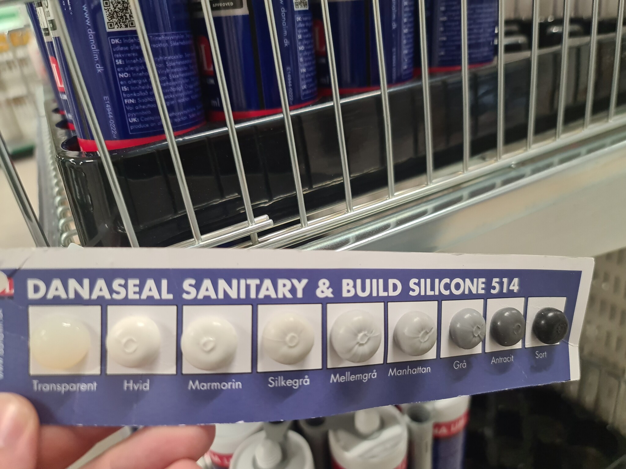 Jag tog bort en bra bit av de gamla silikonet med till lokala Bauhaus och jämförde. Med en färgkarta vilken då ledde mig till färgen Manhattan. Men som nämnt var det fel, annan skribent nämnde att man måste jämföra med riktiga silikon prover vilket hade varit kanon.