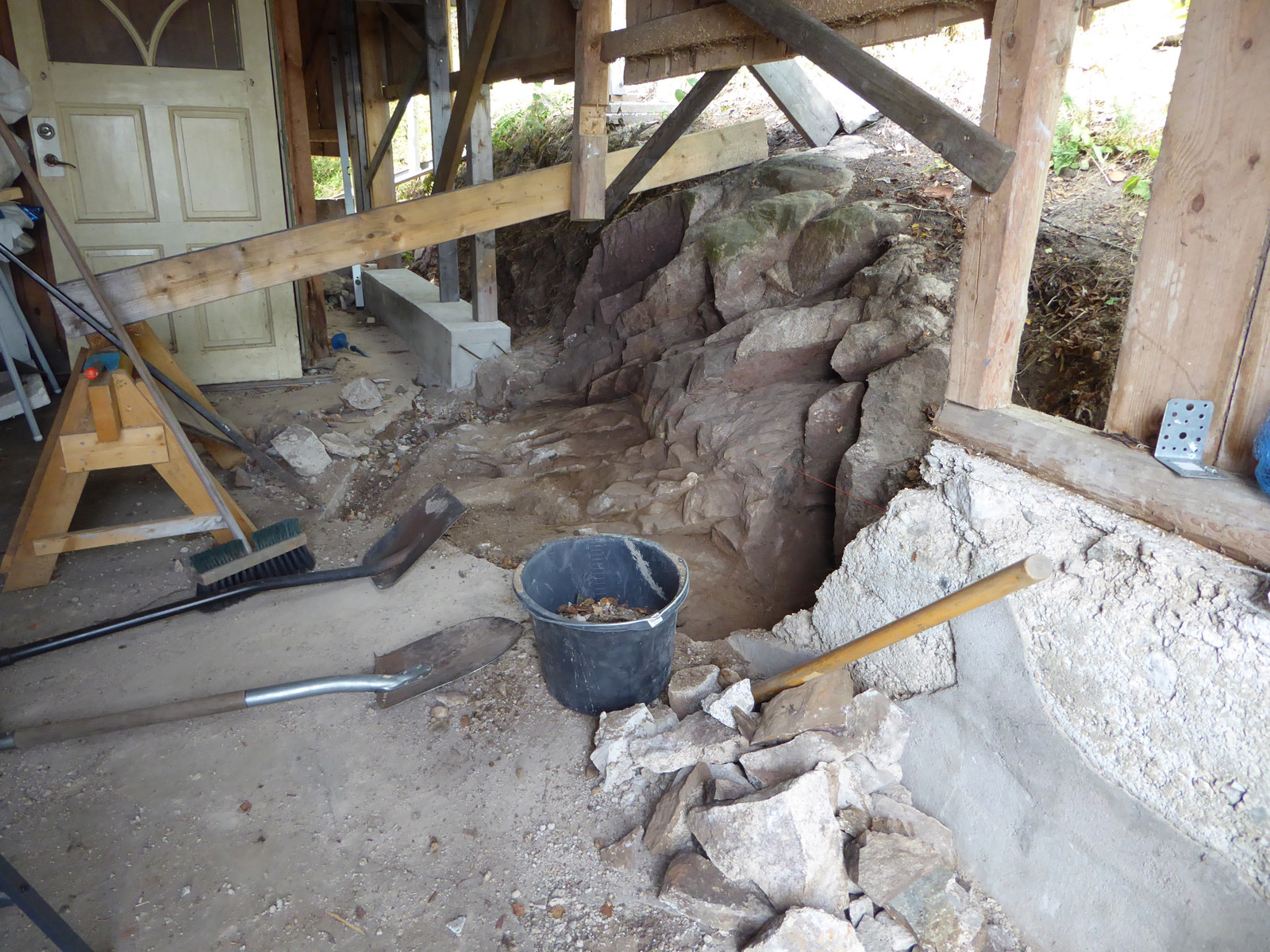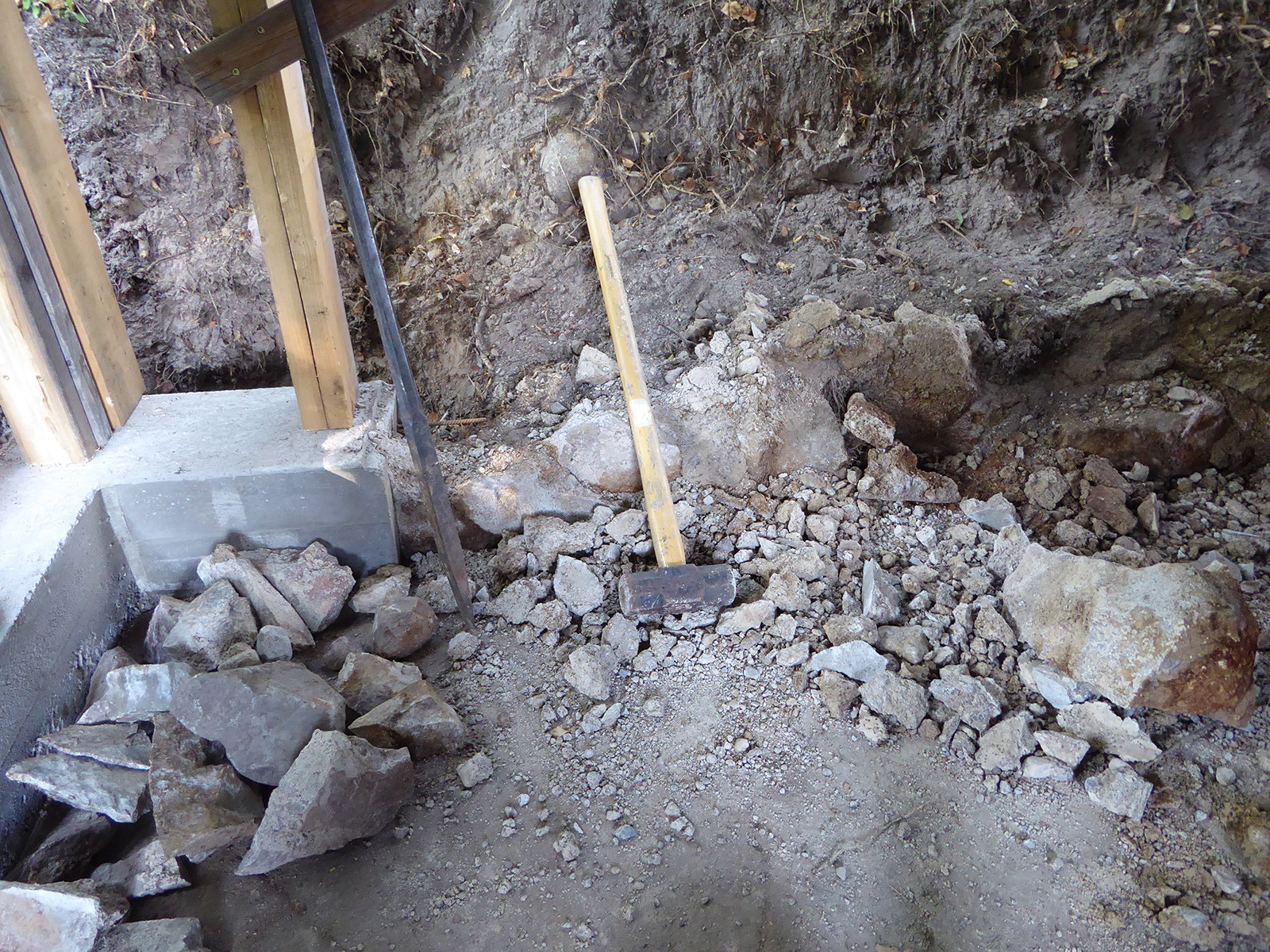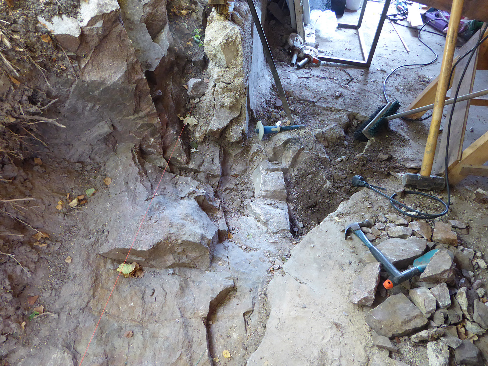 Hackade bort så mycket löst berg jag kunde, men det gick sådär med bara vanlig slägga, hammare och huggmejsel. Inga lösa bitar kvar där grundmuren ska vara i alla fall. I själva golvet kanske jag försöker jobba vidare och jämna till lite mer sen.