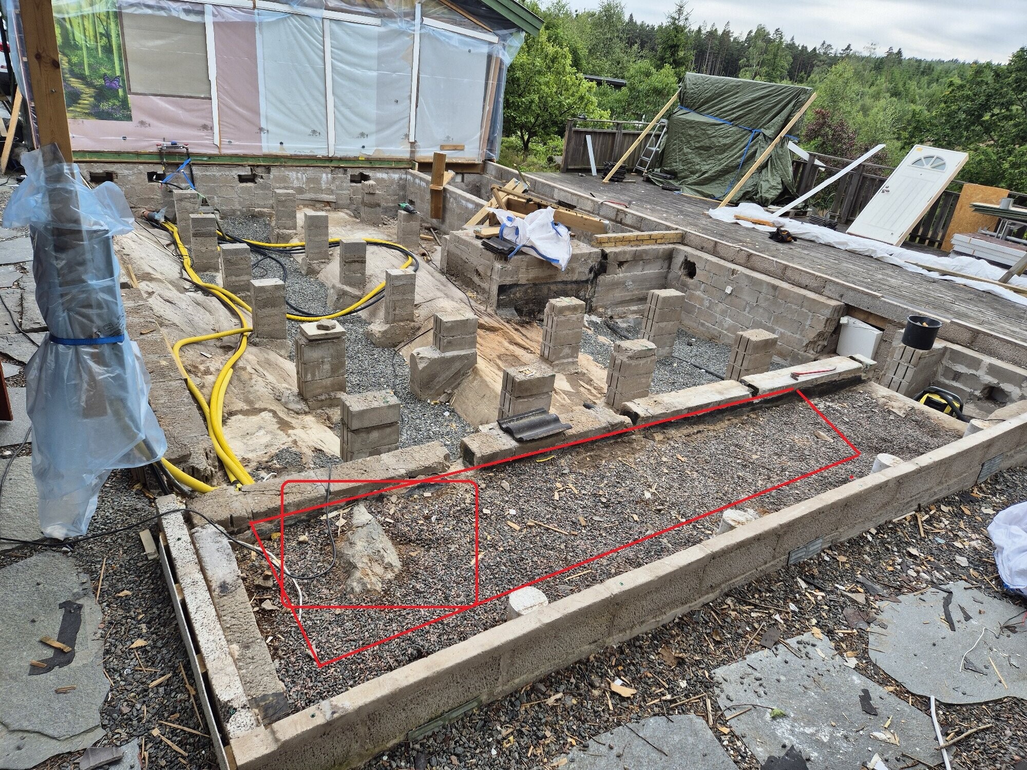 Håller på med en ombyggnad där jag rivet ett enplanshus med yttermått 12*8. På samma plats ska jag nu resa ett 1,5 planshus med yttermått 12*10. Det gamla huset var ifrån 1964 och i dåligt skick därför vi valde att riva det istället för att bygga ut. Planen var att riva grunden med och fylla upp med makadam till rätt nivå för att montera en färdig grund ifrån tjällden då jag har byggt ett mindre hus tidigare med hjälp av deras grundpaket.