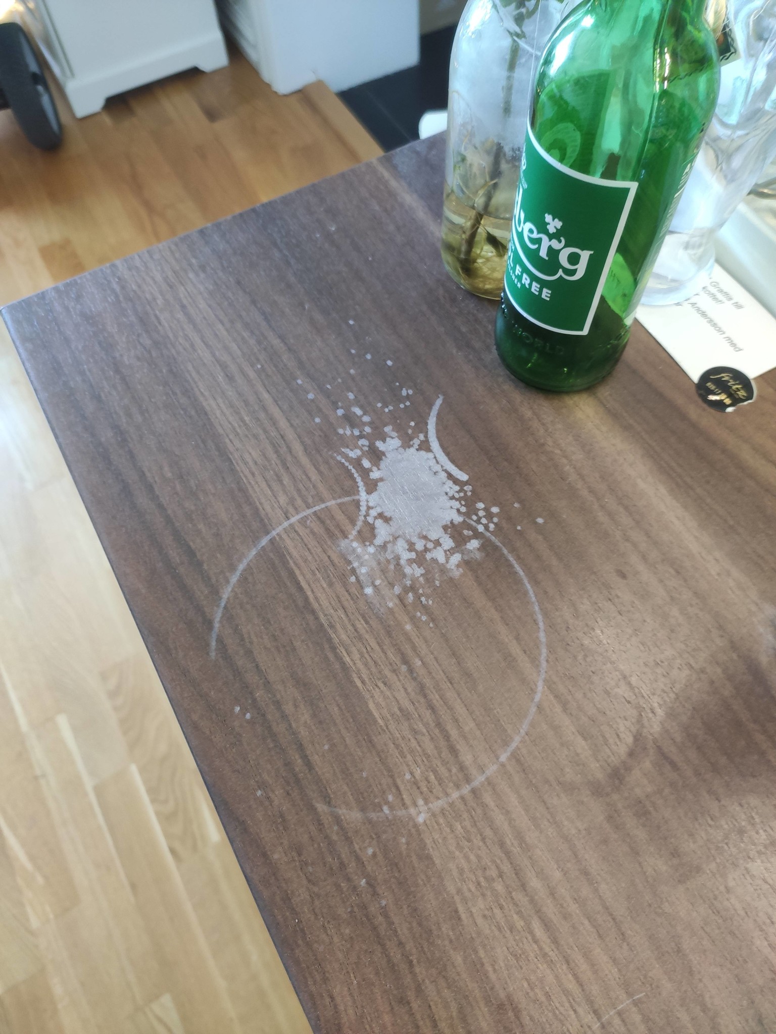 Jag har gjort något dumt. Jag glömde en flaska Hessa kalkbort (fosforsyra) på vår köksbänk. Nu har det blivit vita fläckar på bänkskivan. Bänkskivan är laminat från Ikea.