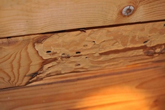 Är du säker på att detta inte är hål som har funnits sedan tidigare? Kan ju i bästa fall vara ett angrepp som inte längre är aktivt. Hur som helst är det svårt att utifrån en bild se vad det är för slags hål, t.ex. hur stora dom är. I värsta fall kan det ju vara husbock. Det är därför jag säger att du ska kontakta anticimex.