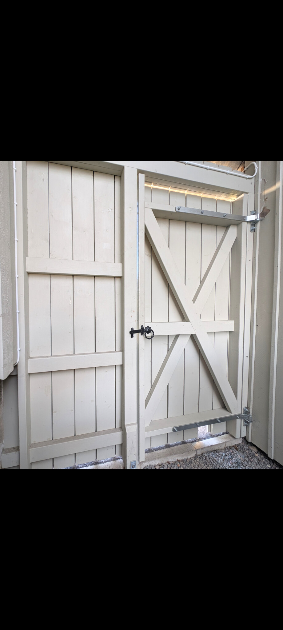 Tips om du kör med dubbla reglar och fasadbrädor är att tänka på det totala djupet när du bygger porten. Det är ju typ 120mm djupt som ska löpa fritt när porten öppnas, så lämna en rejäl glipa mellan portens regelverk (där handtaget sitter) och "karmen", annars tar de i varandra vid öppning.