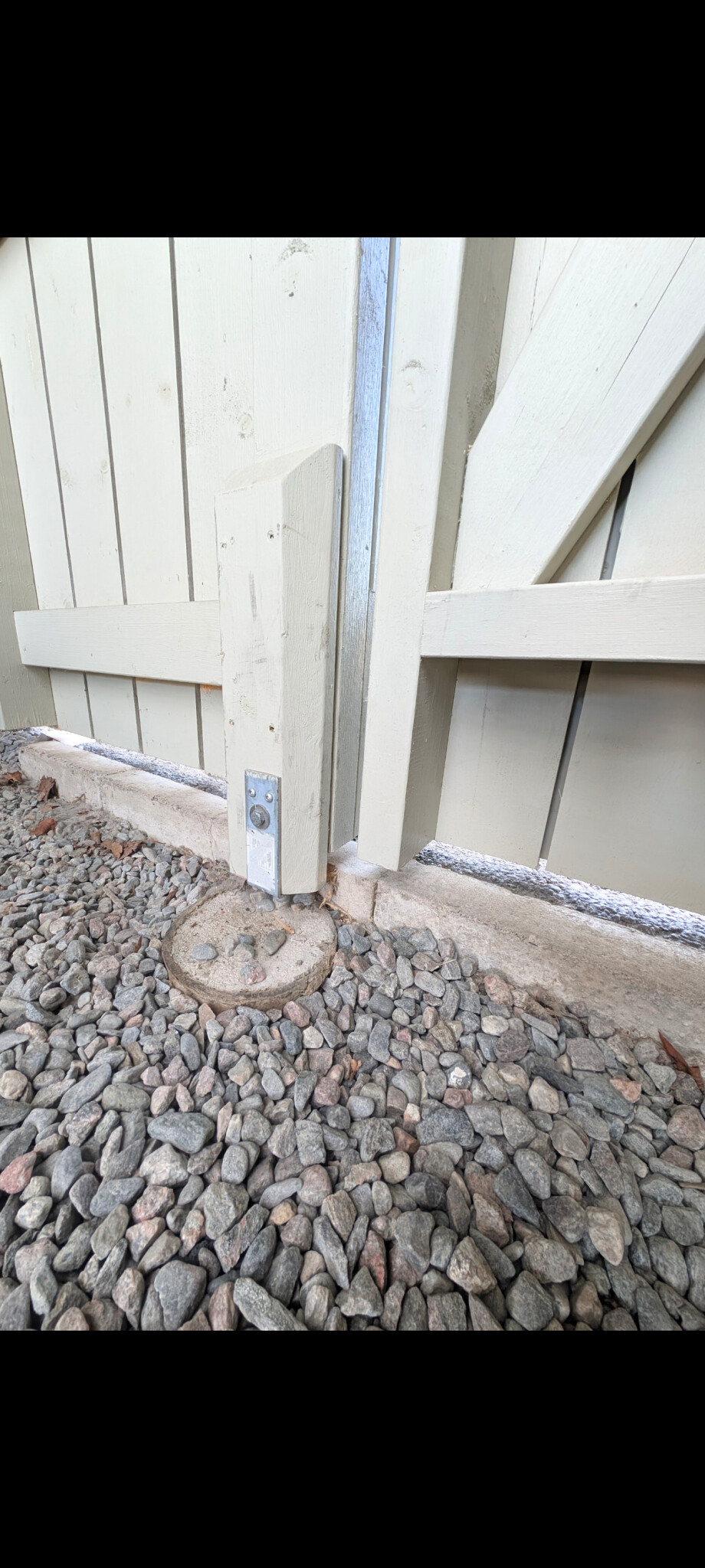 Problemet är att exakt under tänkta port/vägg ligger idag kantsten på högkant, så kan inte sätta plint där. På ena sidan kantstenen är det grus, andra sidan asfalt. Dörren/porten hängs i garageväggen på 95x95, så den blir helt stum, andra delen av mellanväggen hängs i fasaden. Stolpen i mitten behöver dock stöd nedtill för att inte fladdra runt.