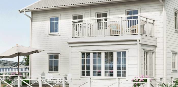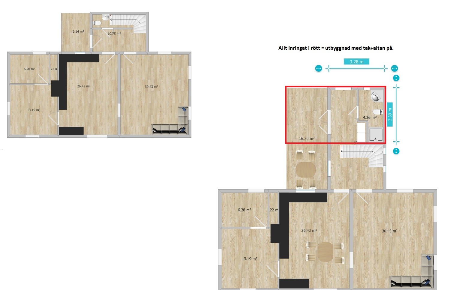 Någon som kan hjälpa oss skissa upp hur det skulle kunna se ut med en utbyggnad med platt tak och balkong på och få den att passa vårt hus?
