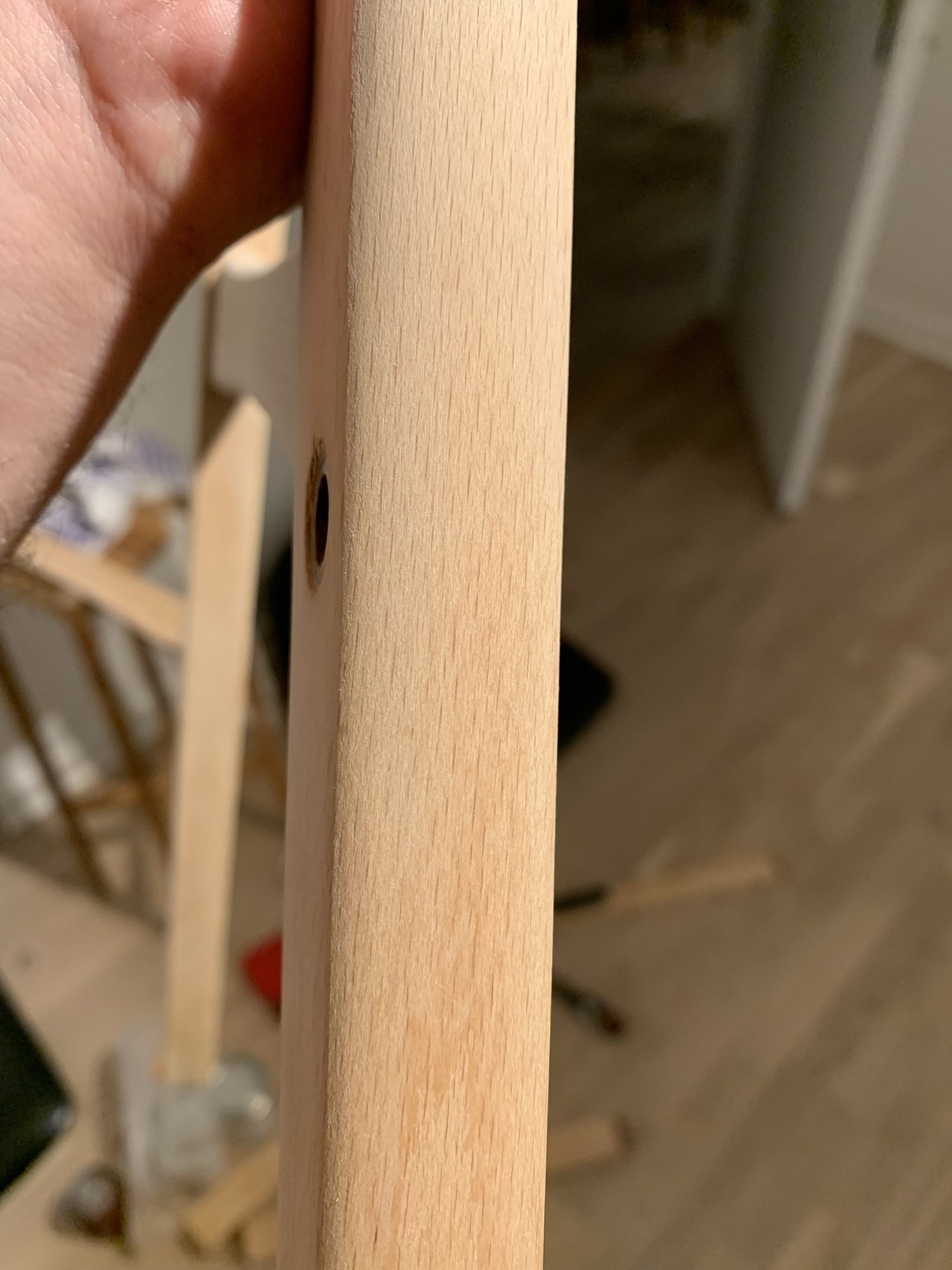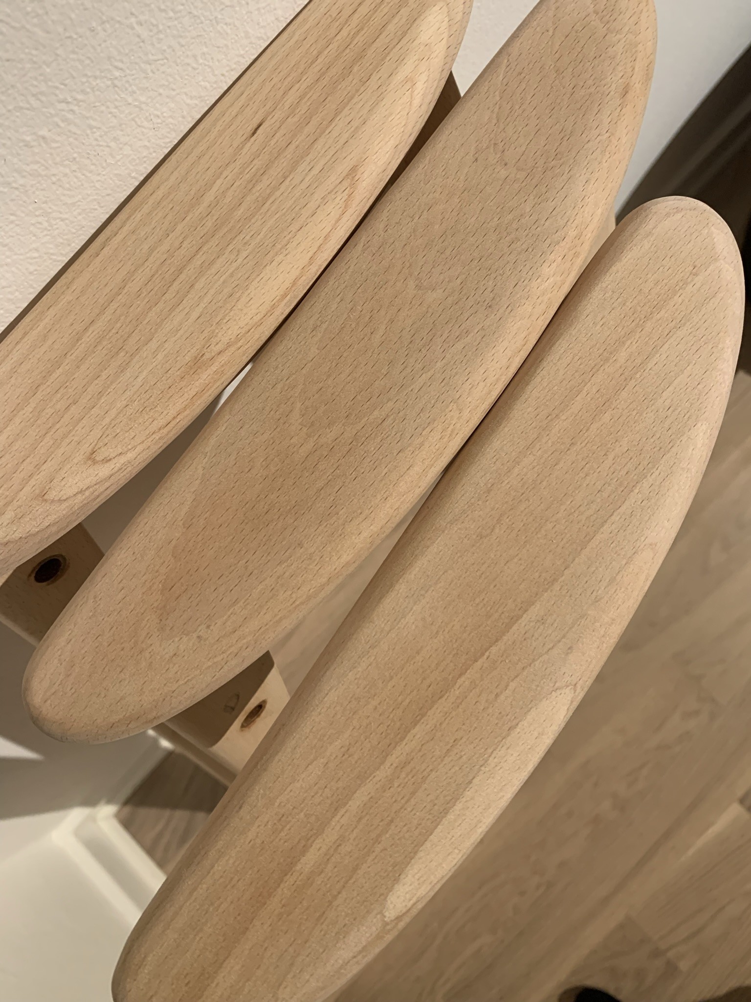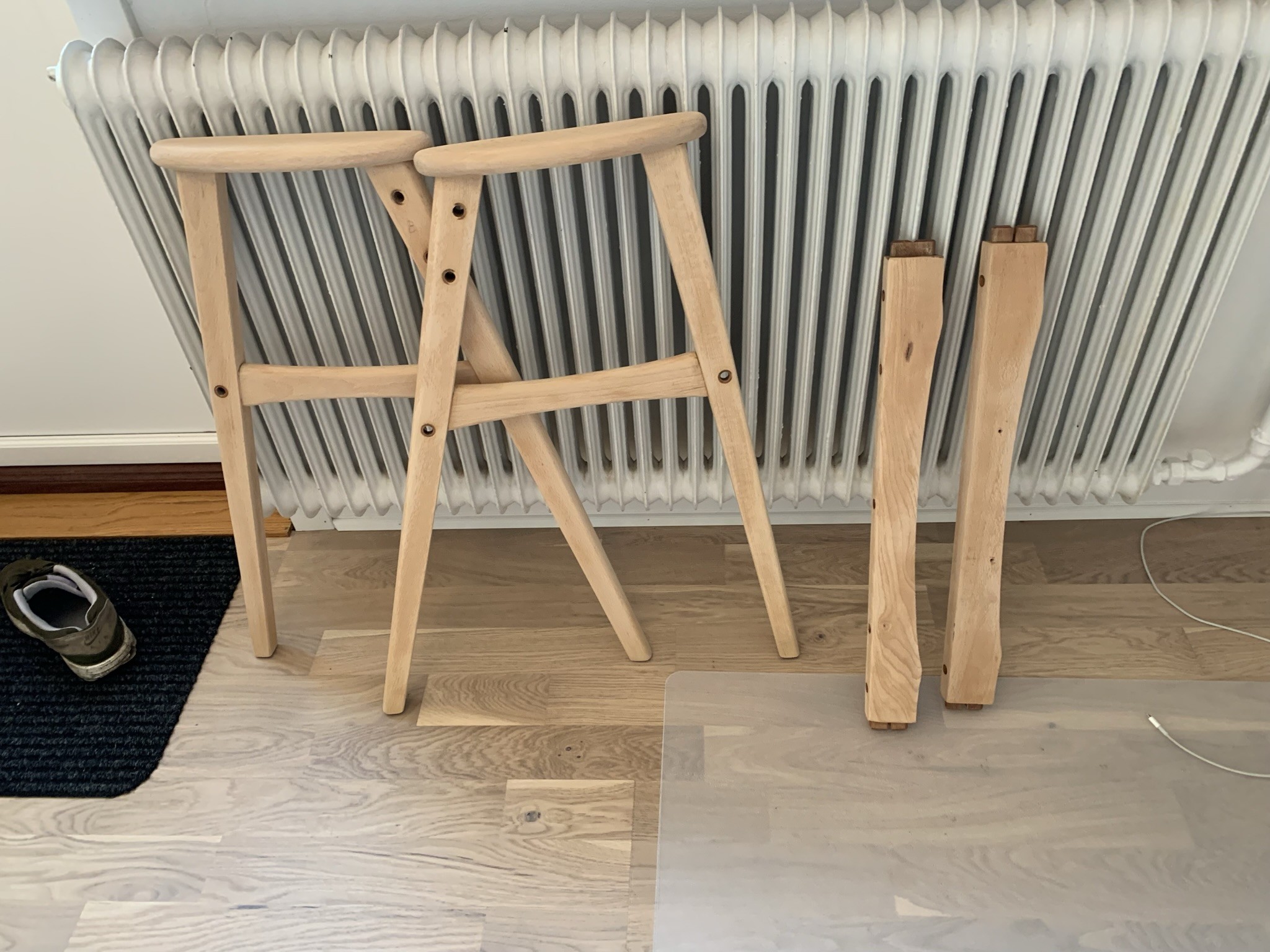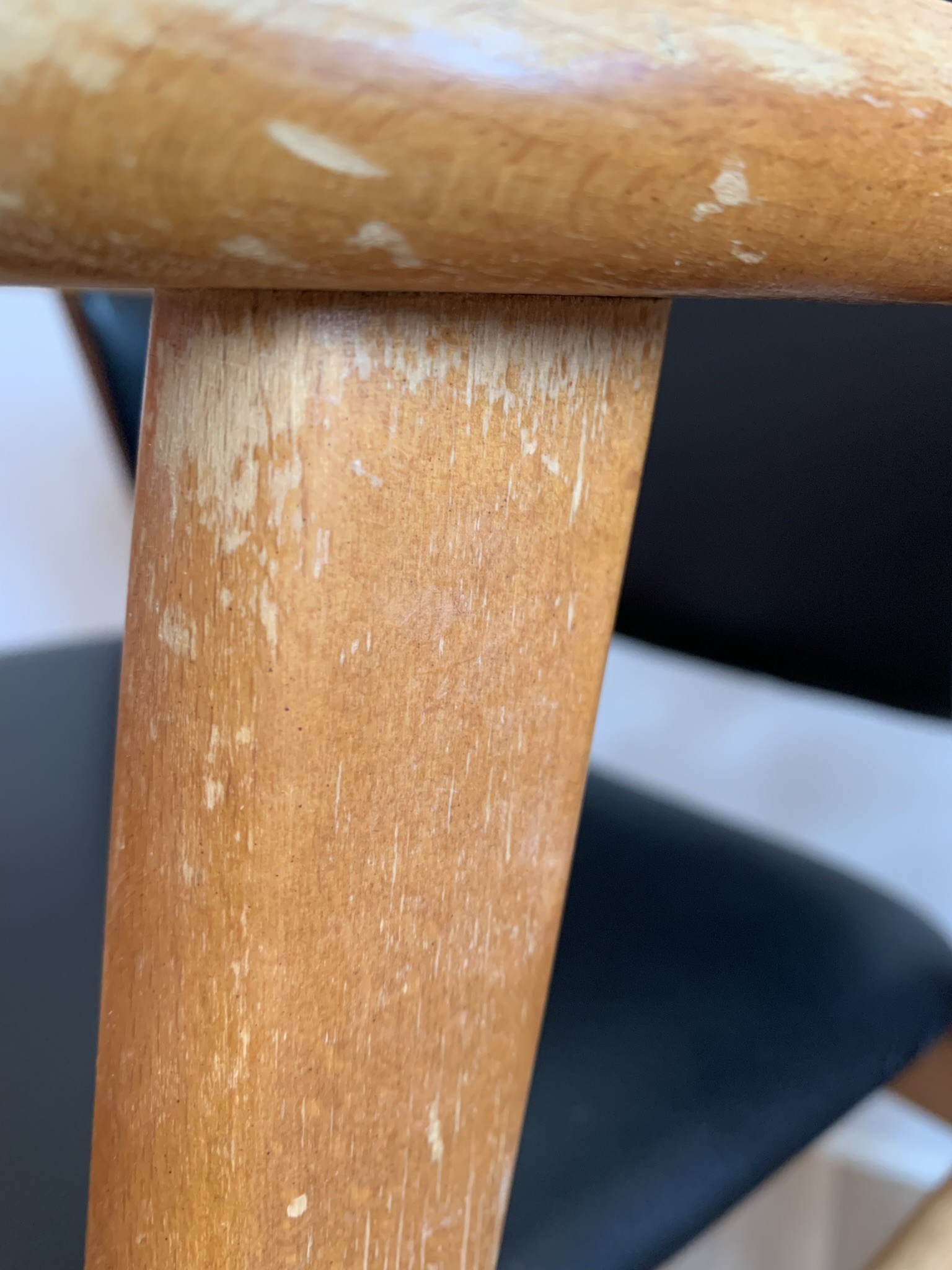 Osäker på träslag då stolarna skiljer sig lite men jag tror det kan vara bok(?), efter slipning med 120-kornigt: