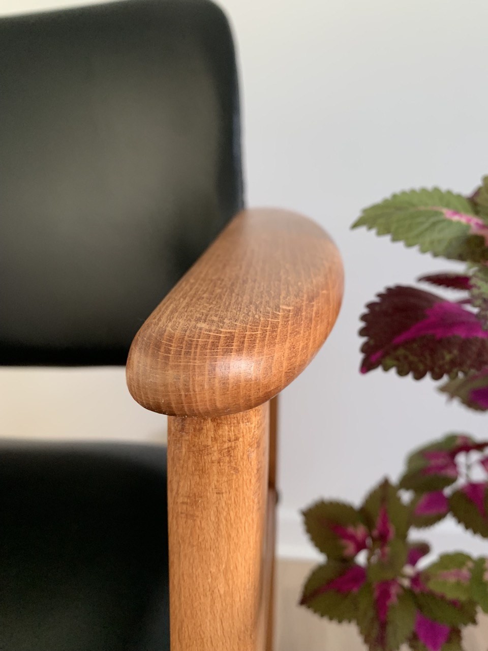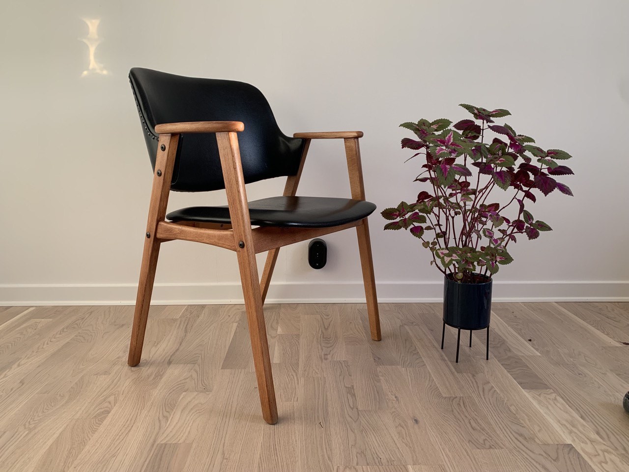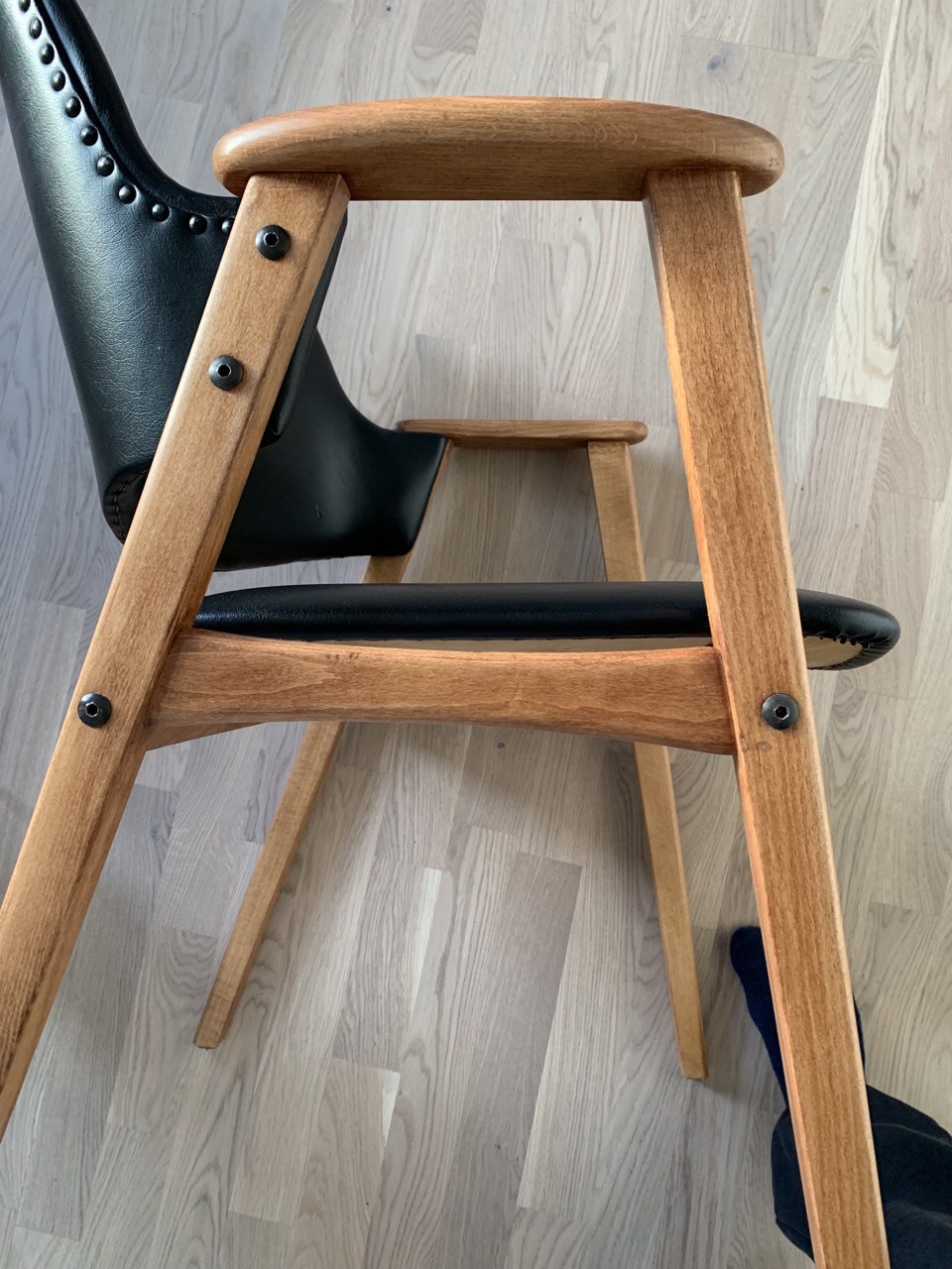 Flera möbler på 60-talet var tillverkade i bok. För att få ett lite mer "rätt" utseende så teak-betsade med stolarna.