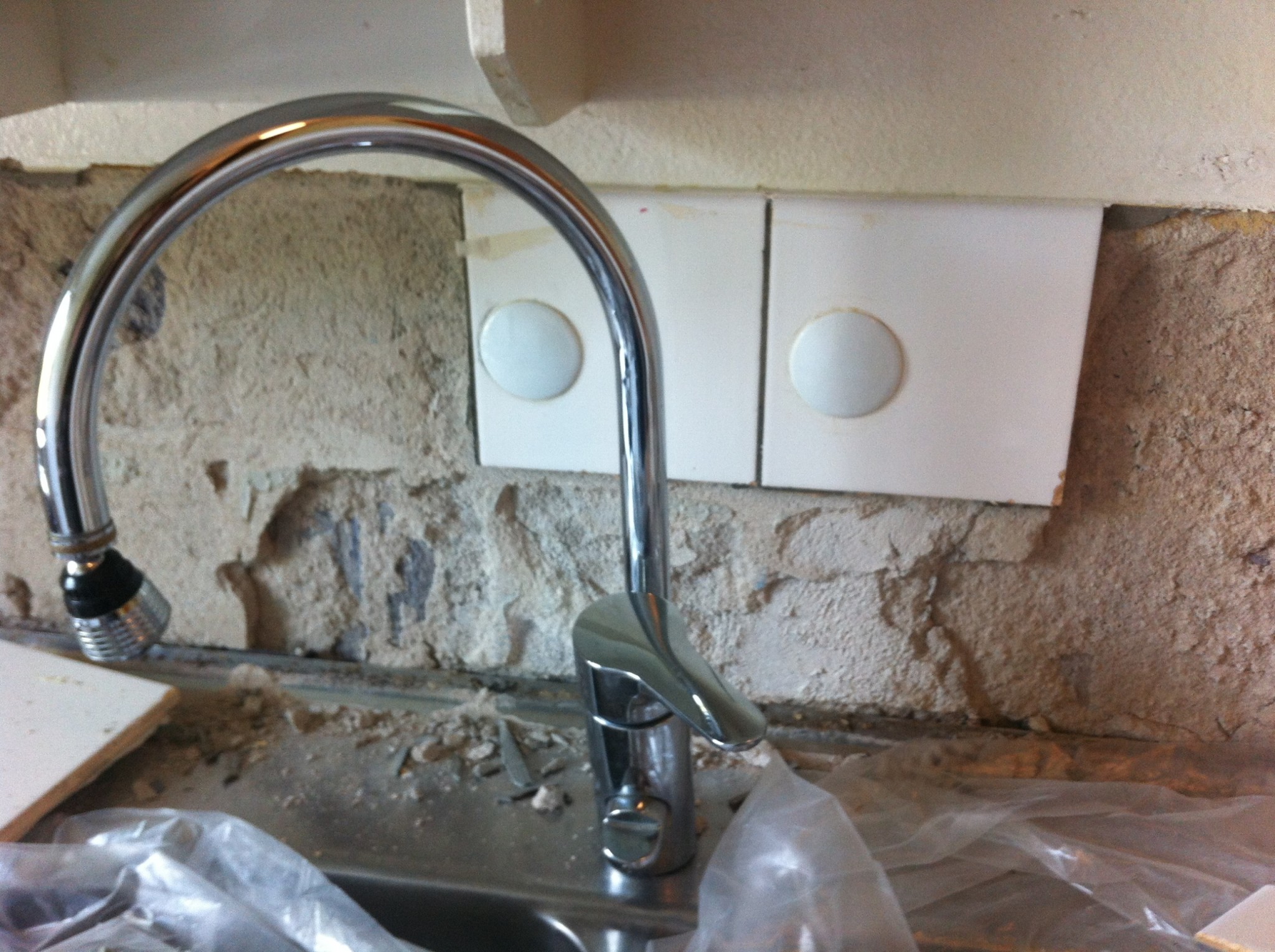 Jag håller på och ska byta ut kaklet i köket och har stött på två vita lock i kaklet över blandaren. Jag misstänker att det bakom döljer sig rör från en gammal kran som suttit i väggen. Någon som vet om min gissning är rätt? Och i så fall, kan jag knacka bort kaklet med locken? Eller kommer det att börja spruta vatten?