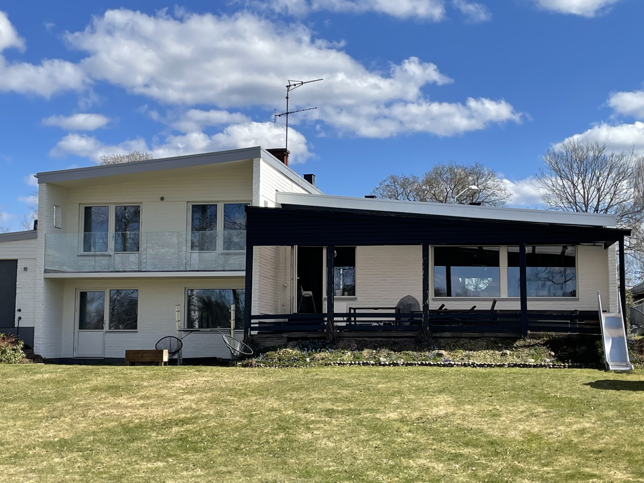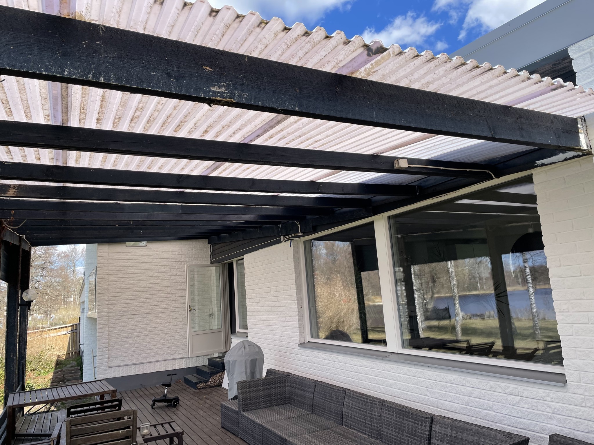 Vi har ett gammalt skärmtak över vår altan som är på väg att falla ihop. Min tanke är att riva detta och bygga ut det befintliga taket istället. Jag har fått bygglov för detta. Storleken kommer att vara detsamma, men istället för plast kommer jag att lägga takpapp, råspont, isolering och panela undersidan så att det liknar taket som går ut över balkongen (se bild). Min tanke är att använda mig av limträbalkar och minska antalet takpelare från 5 till 3 för att få ett så rent estetiskt uttryck så möjligt.